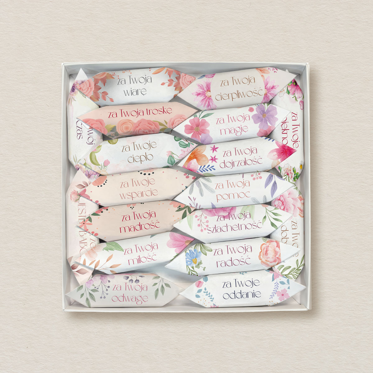 Dzień babci – Krówki z życzeniami w kwadratowym pudełku