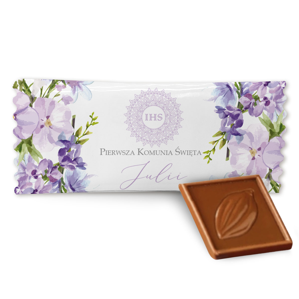 Czekoladki komunijne personalizowane dla gości – 10 szt. | Fioletowe kwiaty
