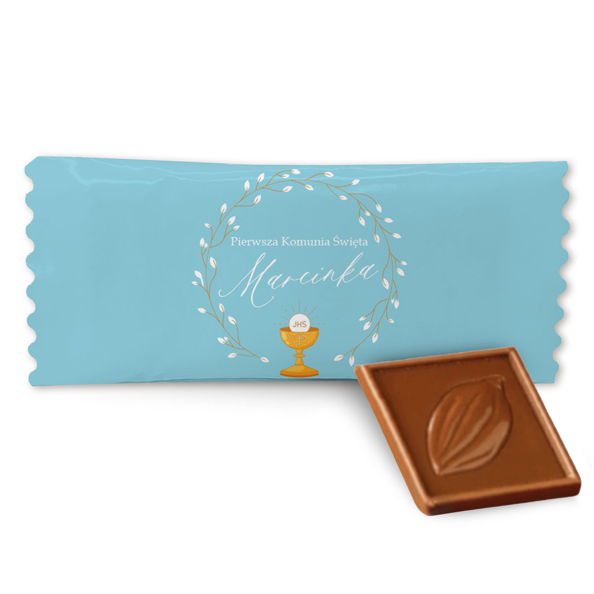 Czekoladki komunijne personalizowane dla gości – 10 szt. | Niebieski wianek