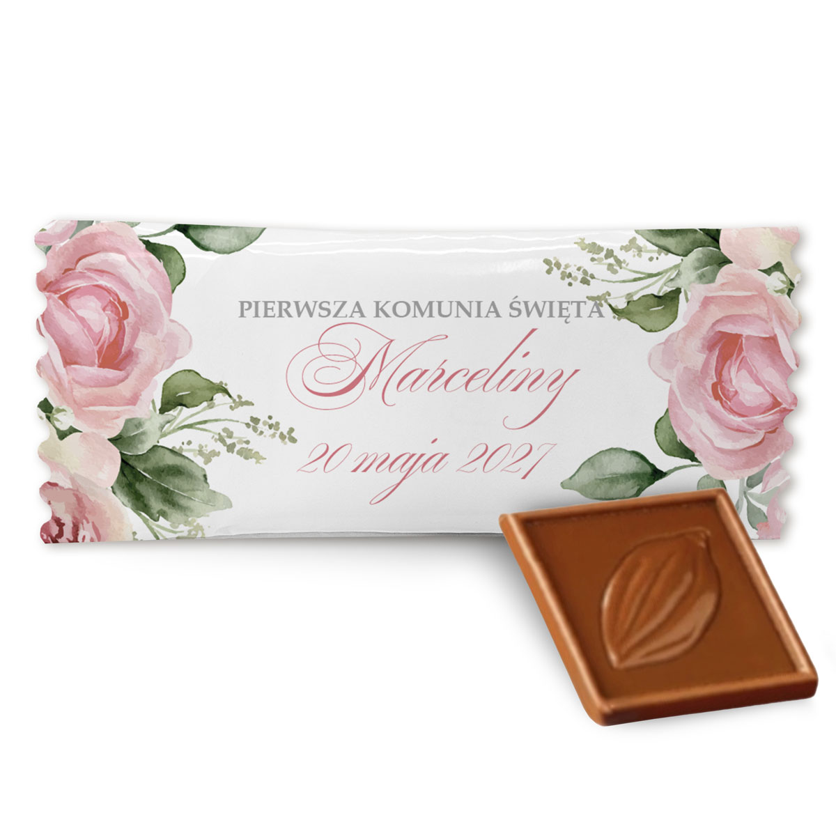 Czekoladki komunijne personalizowane dla gości – 10 szt. | Różowe róże