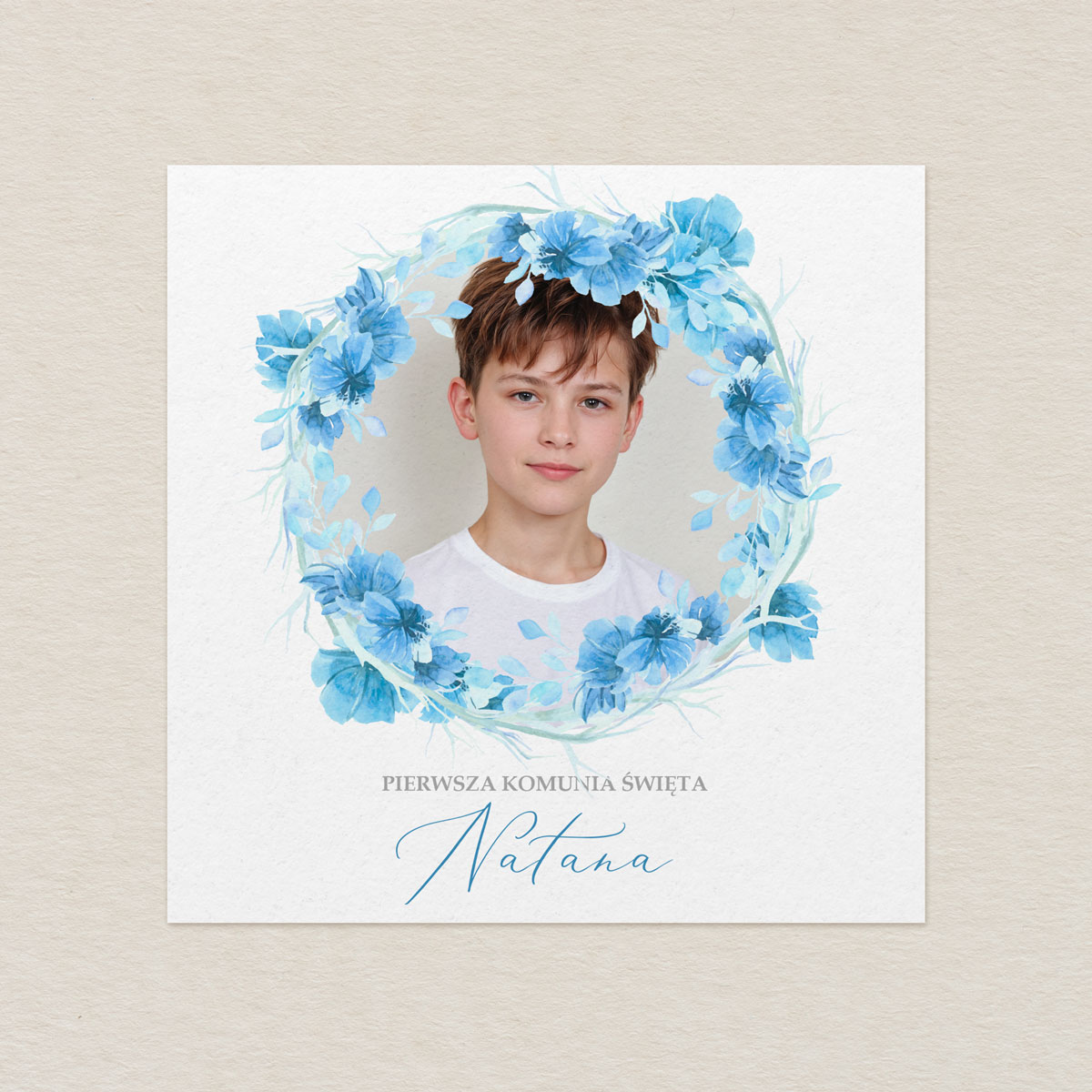 Zaproszenie na Komunię ze zdjęciem – Niebieski Wianek Kwiatowy
