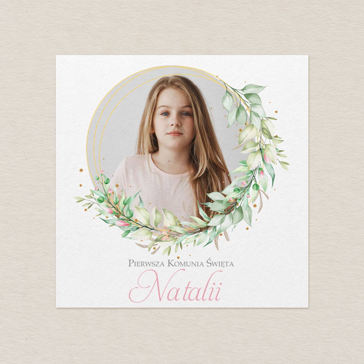 Zaproszenie na Komunię ze zdjęciem – Zielony Wianek Gold Line