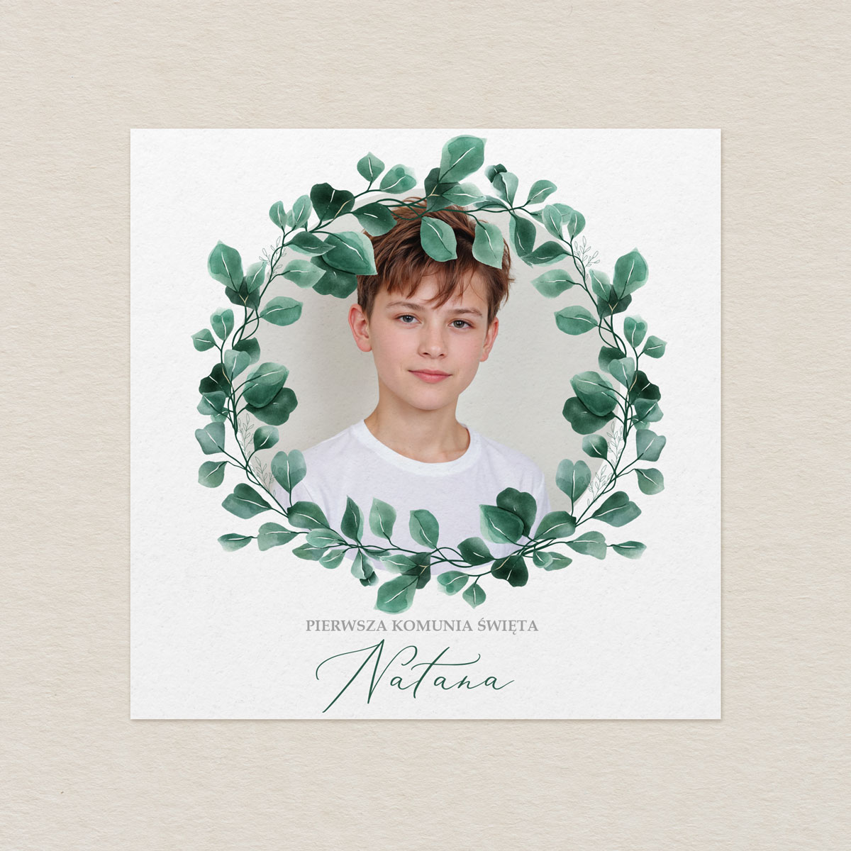 Zaproszenie na Komunię ze zdjęciem – Zielony Wianek Eukaliptus