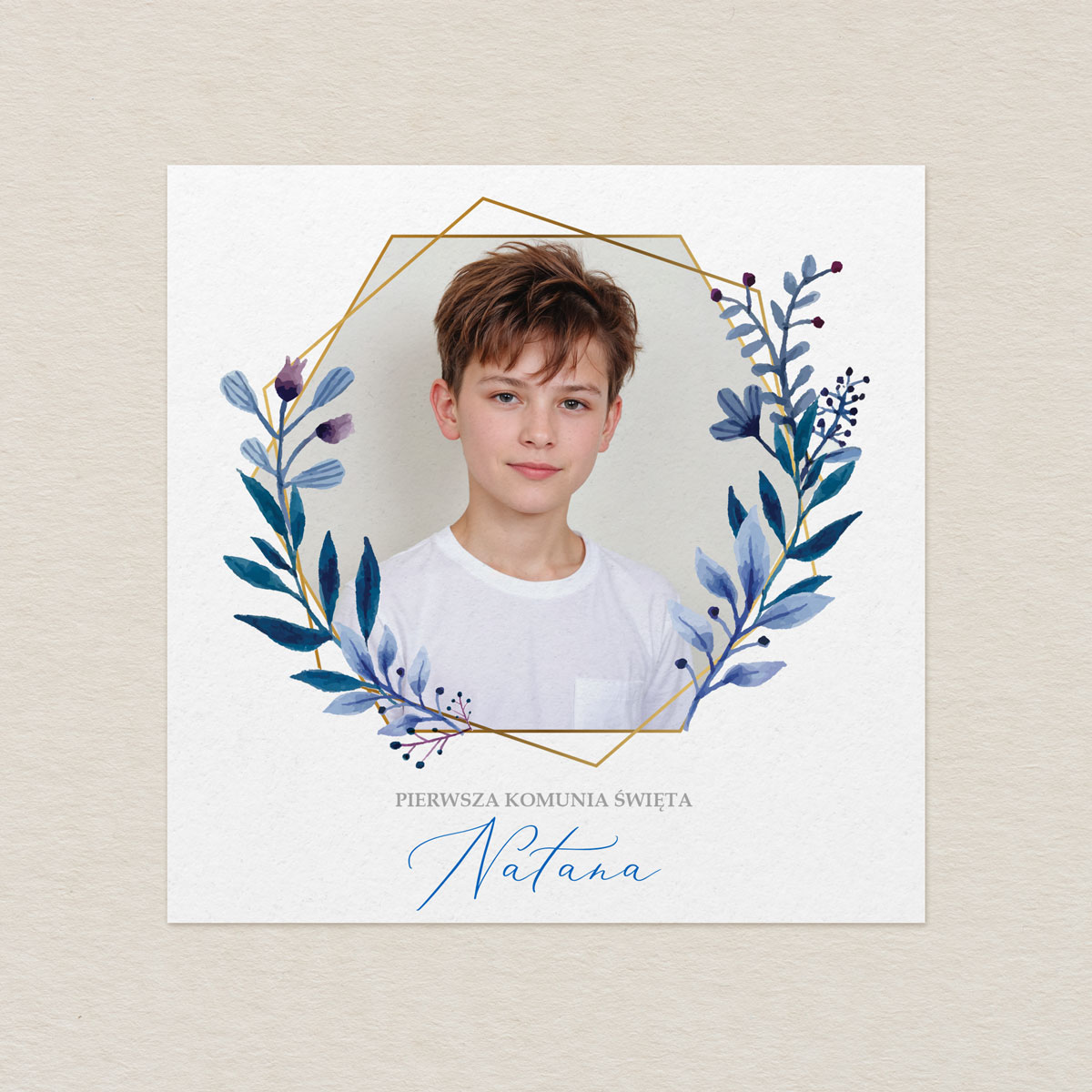 Zaproszenie na Komunię ze zdjęciem – Geometryczny Wianek Blue