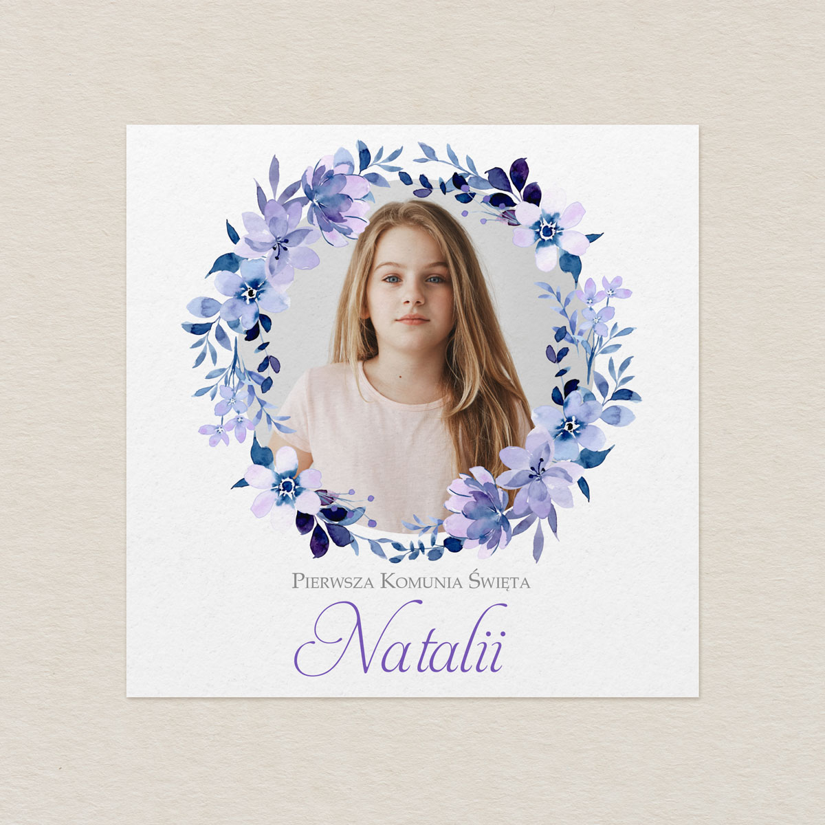 Zaproszenie na Komunię ze zdjęciem – Lawendowy Wianek Akwarela