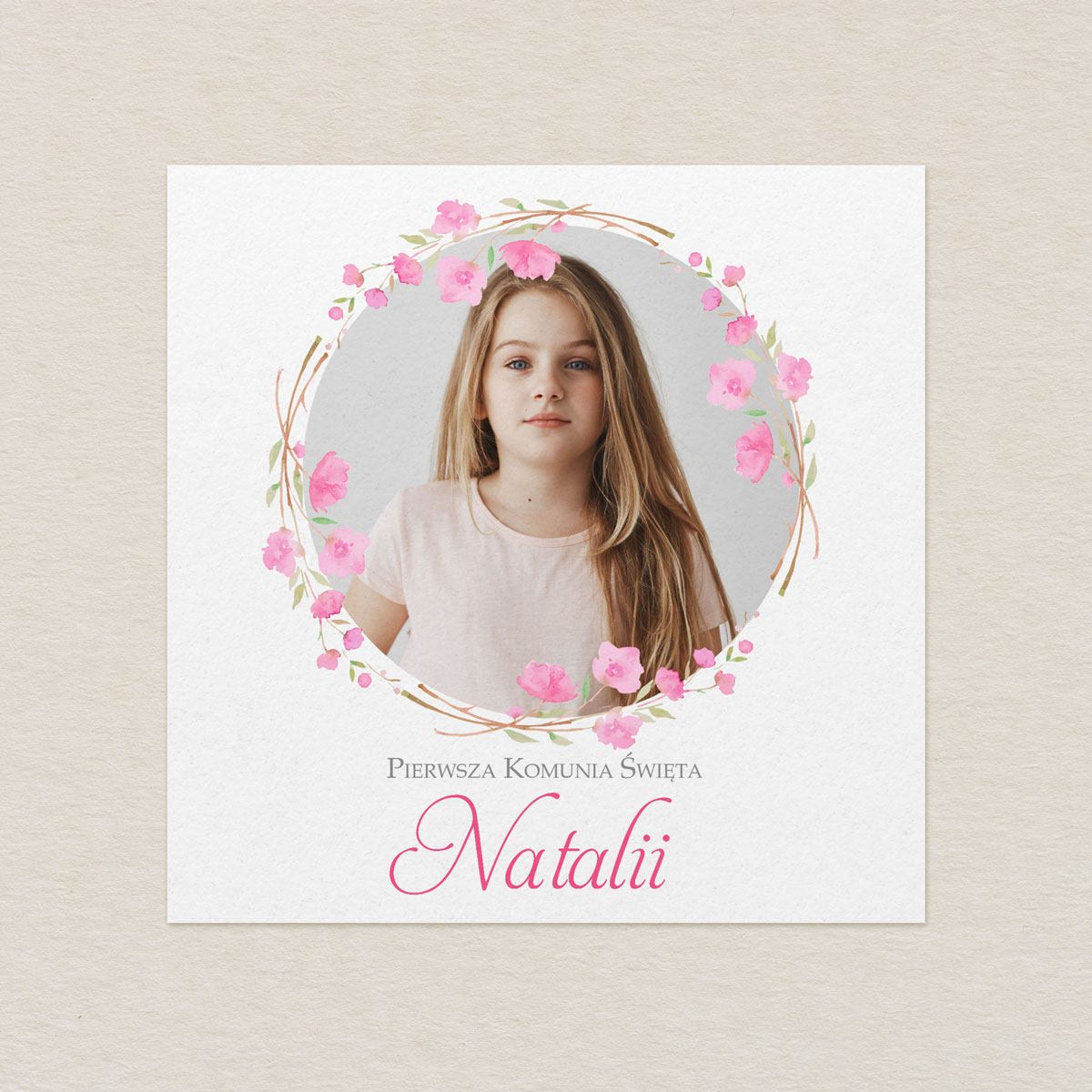 Zaproszenie na Komunię ze zdjęciem – Różowy Wianek Floral