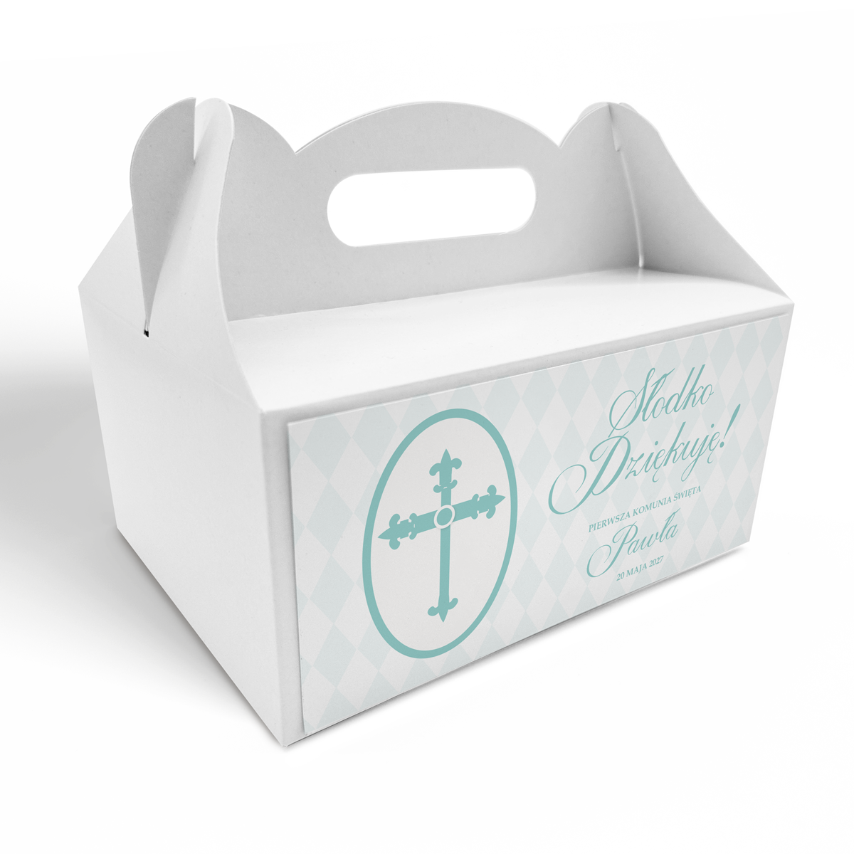Pudełko na ciasto komunijne – Miętowa Kratka
