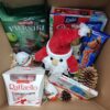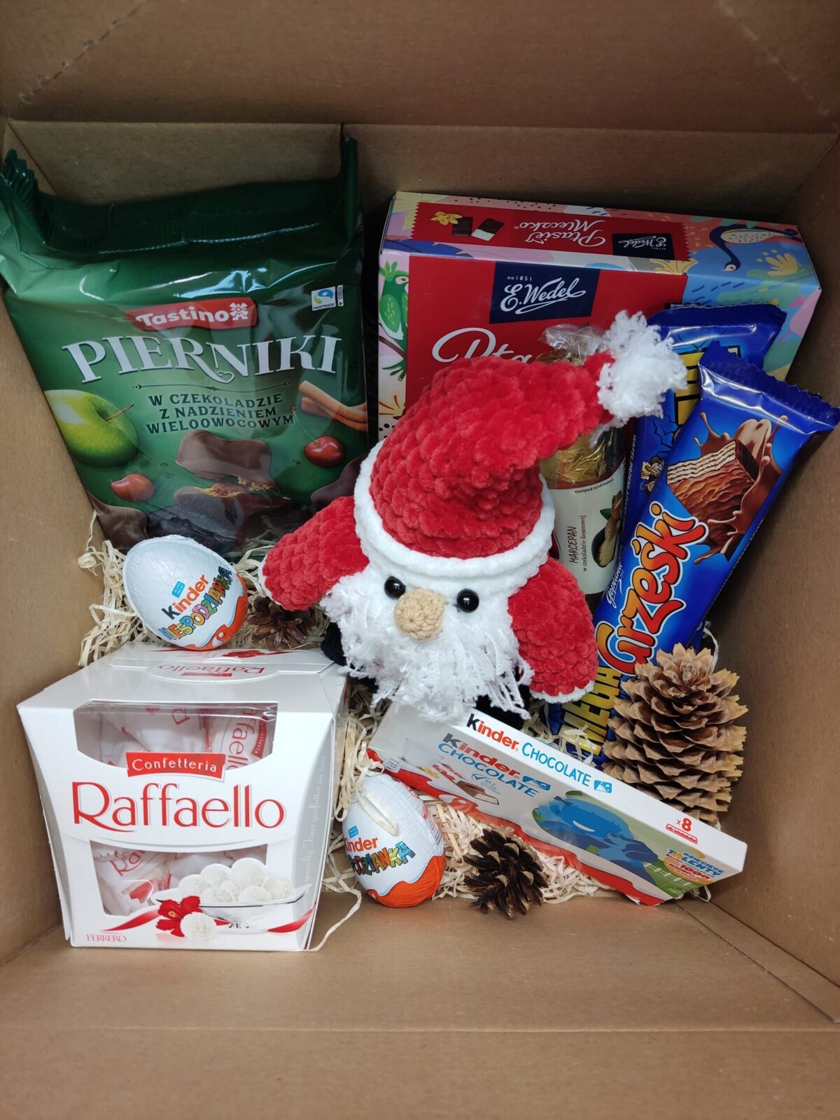 w zestawie: Pluszak Mikołaj, Ptasie mleczko 340g Wedel, 2x wafelek Grzesiek, 2x Kinder Niespodzianka, 1 opakowanie kinderków – 100g, 1 x chlebek marcepanowy, 1 x opakowanie Rafaello 150g, Pierniki z nadzieniem wieloowocowym 200g