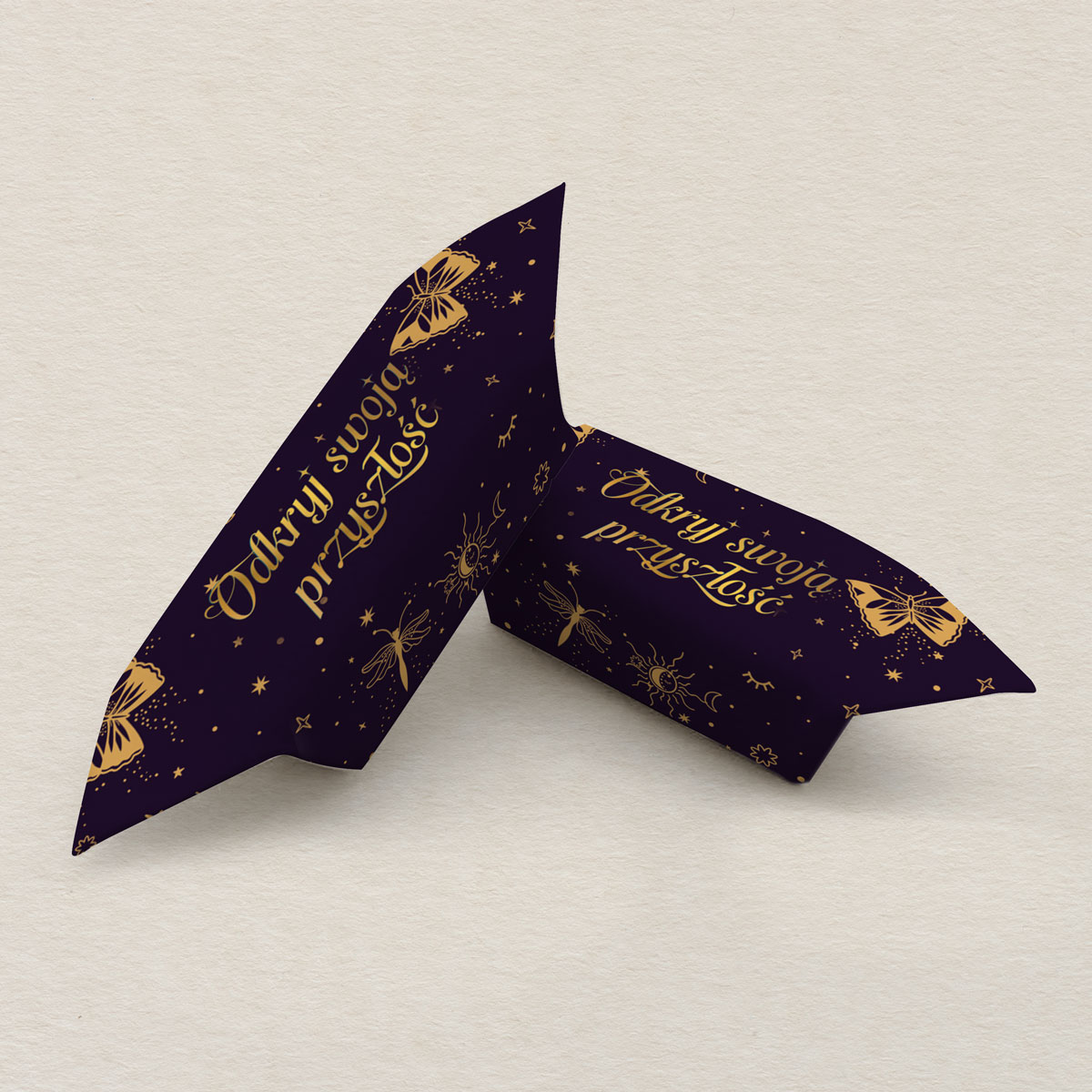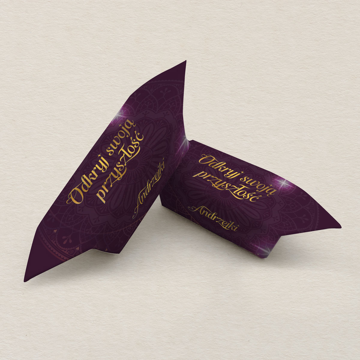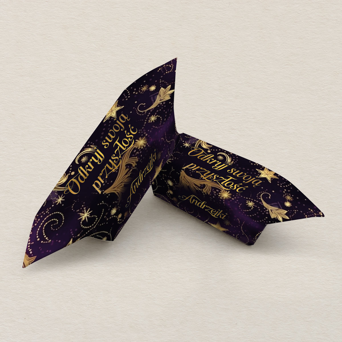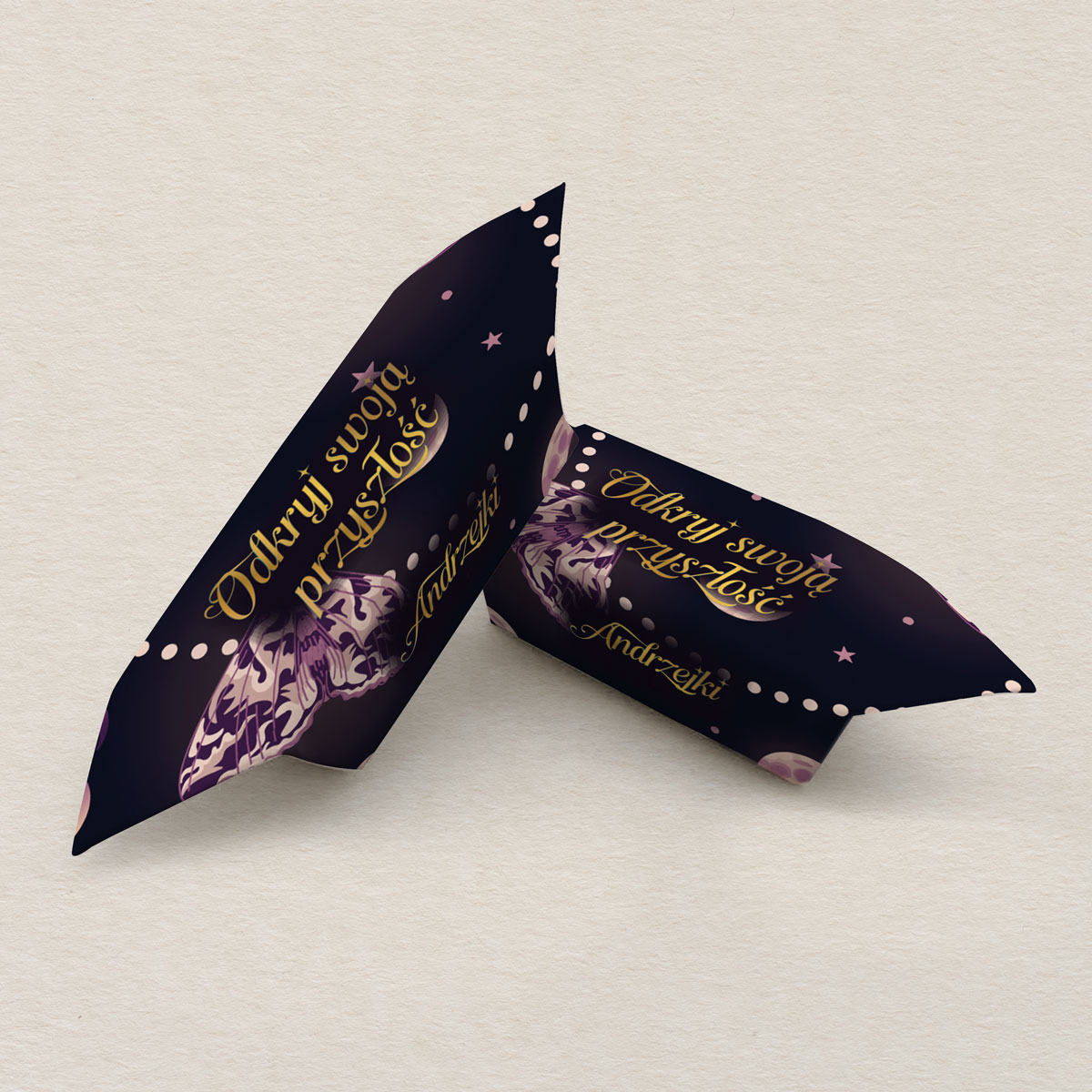 Magiczne krówki andrzejkowe z wróżbą w środku! Pyszne, klasyczne słodycze w eleganckich opakowaniach z motywem nocy wróżb. Idealne na imprezę, do firmy lub jako upominek dla gości.