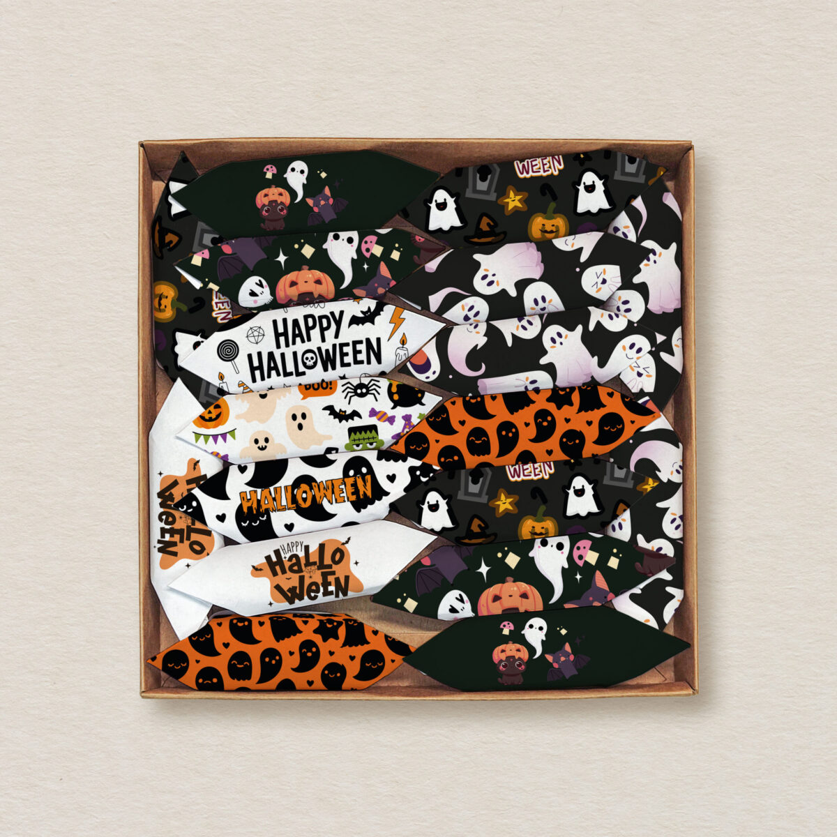 Gotowy do wręczenia – zapakowany w ozdobne pudełko z okienkiem, przewiązane wstążką i udekorowane etykietą Happy Halloween!