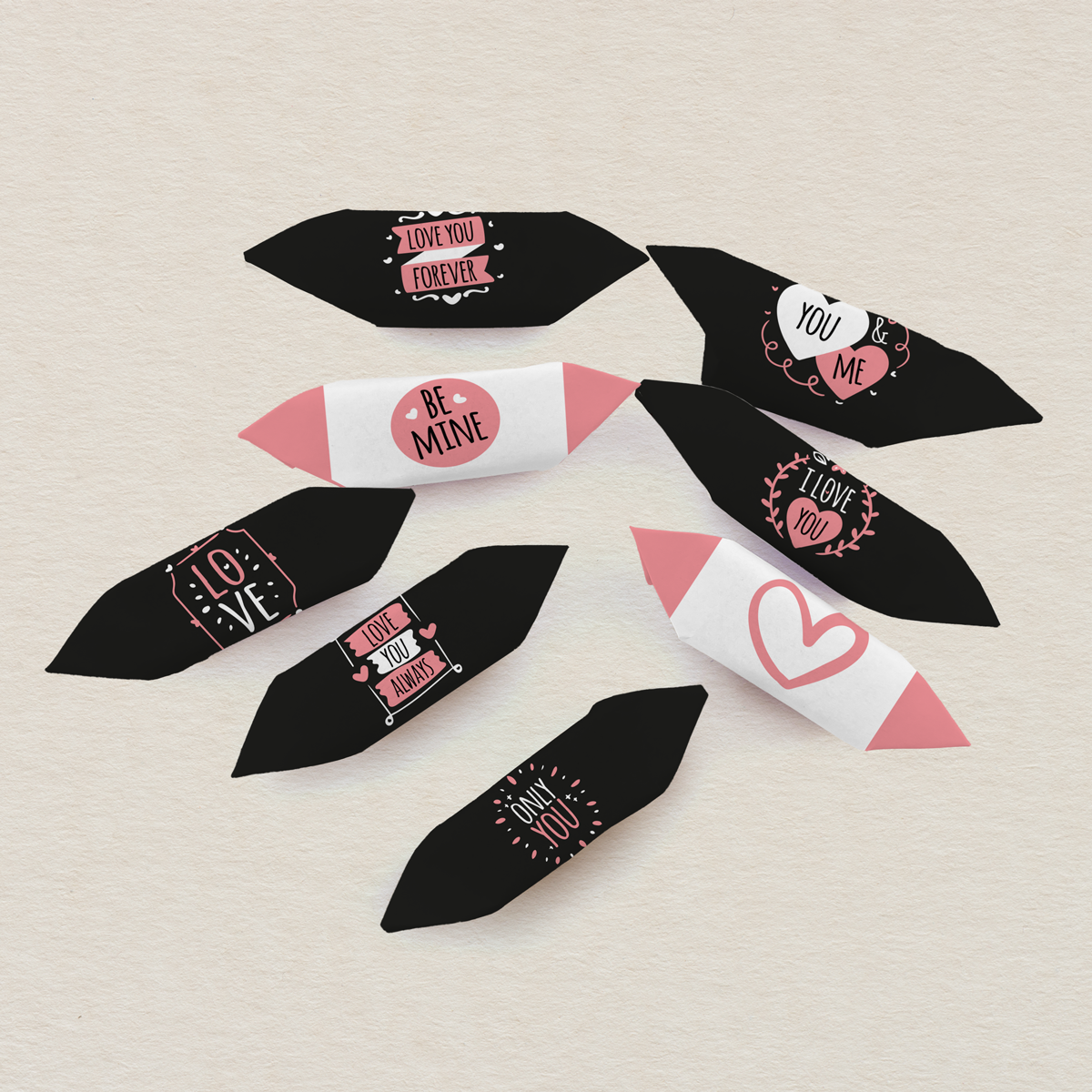 Każda krówka zawiera romantyczny napis, a do zestawu dołączona jest karteczka z możliwością personalizacji.