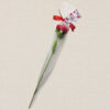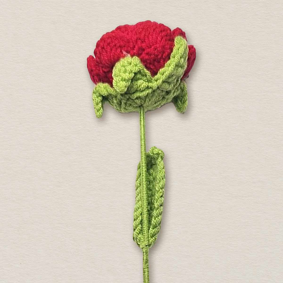Ręcznie robiony kwiat w kształcie róży, zapakowany w elegancki celofan z ozdobną karteczką.