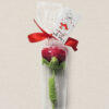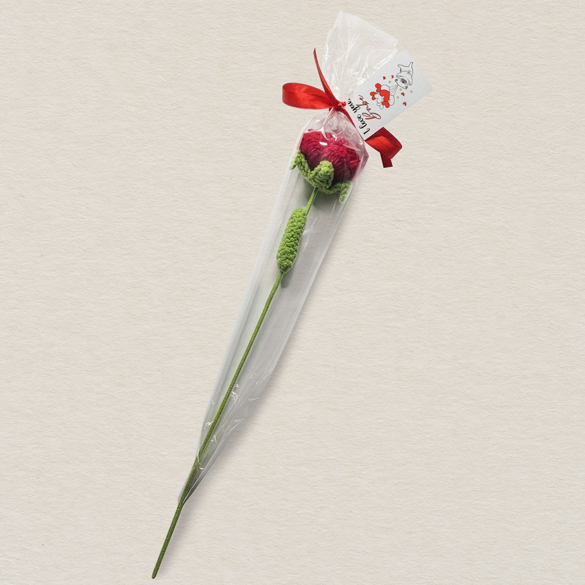 Ręcznie robiony kwiat w kształcie róży, zapakowany w elegancki celofan z ozdobną karteczką.