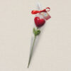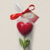 Ręcznie robiony kwiat w kształcie serca, zapakowany w elegancki celofan z ozdobną karteczką.