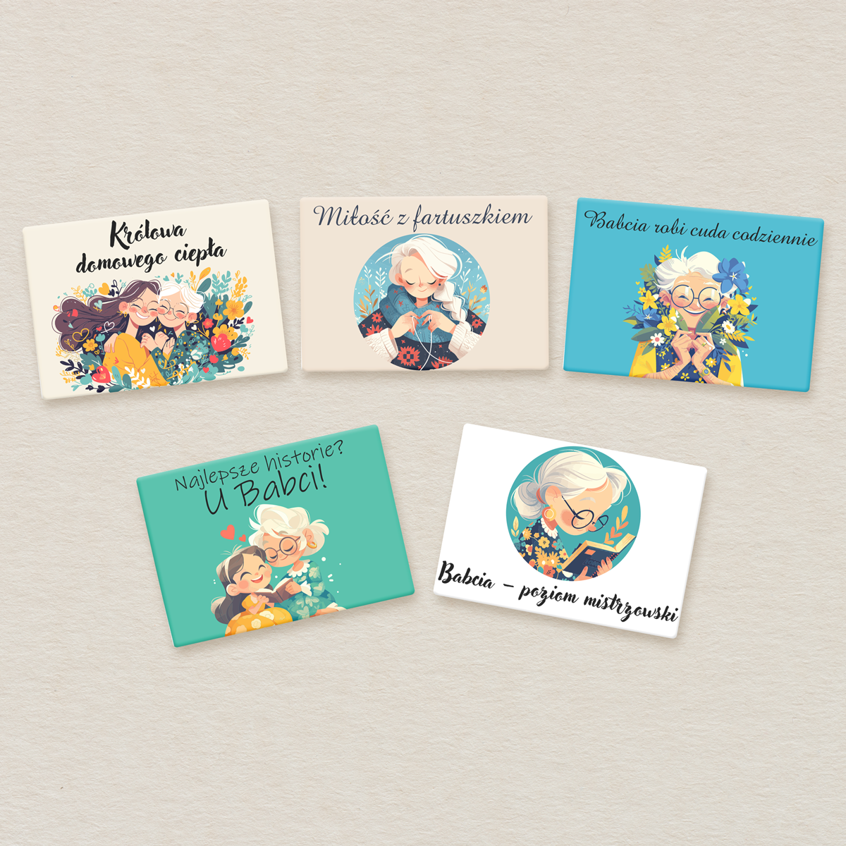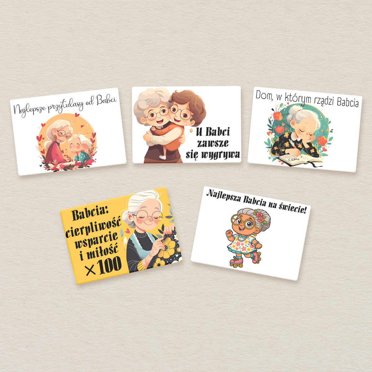 Magnesy na Dzień Babci z dedykacją to uroczy i symboliczny upominek, który każdego dnia będzie przypominał o miłości i wdzięczności. Zestaw zawiera magnesy z ciepłymi hasłami i ilustracjami stworzonymi specjalnie dla Babci. Zapakowane w elegancki woreczek, są gotowe do wręczenia jako wyjątkowy prezent na Dzień Babci lub bez okazji.