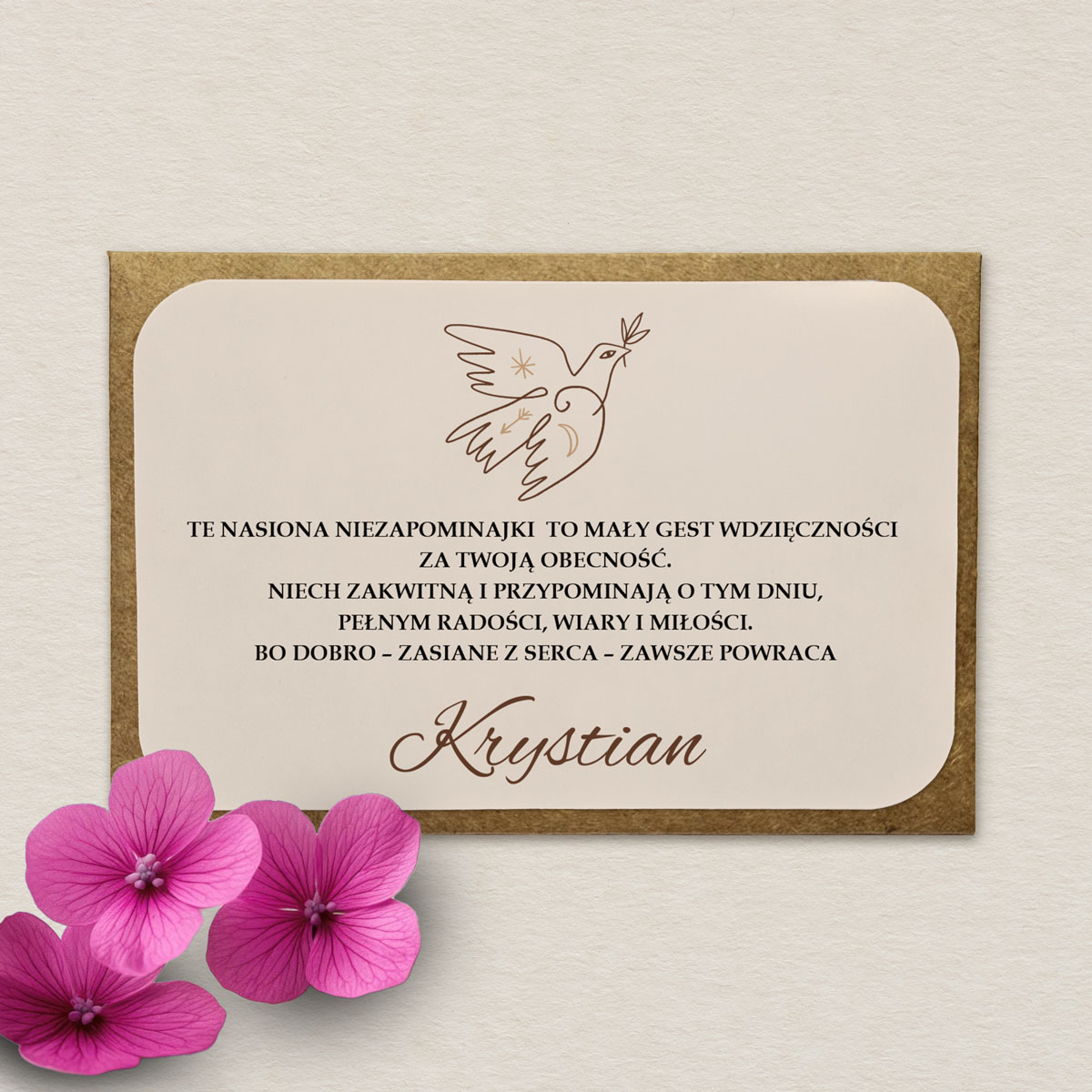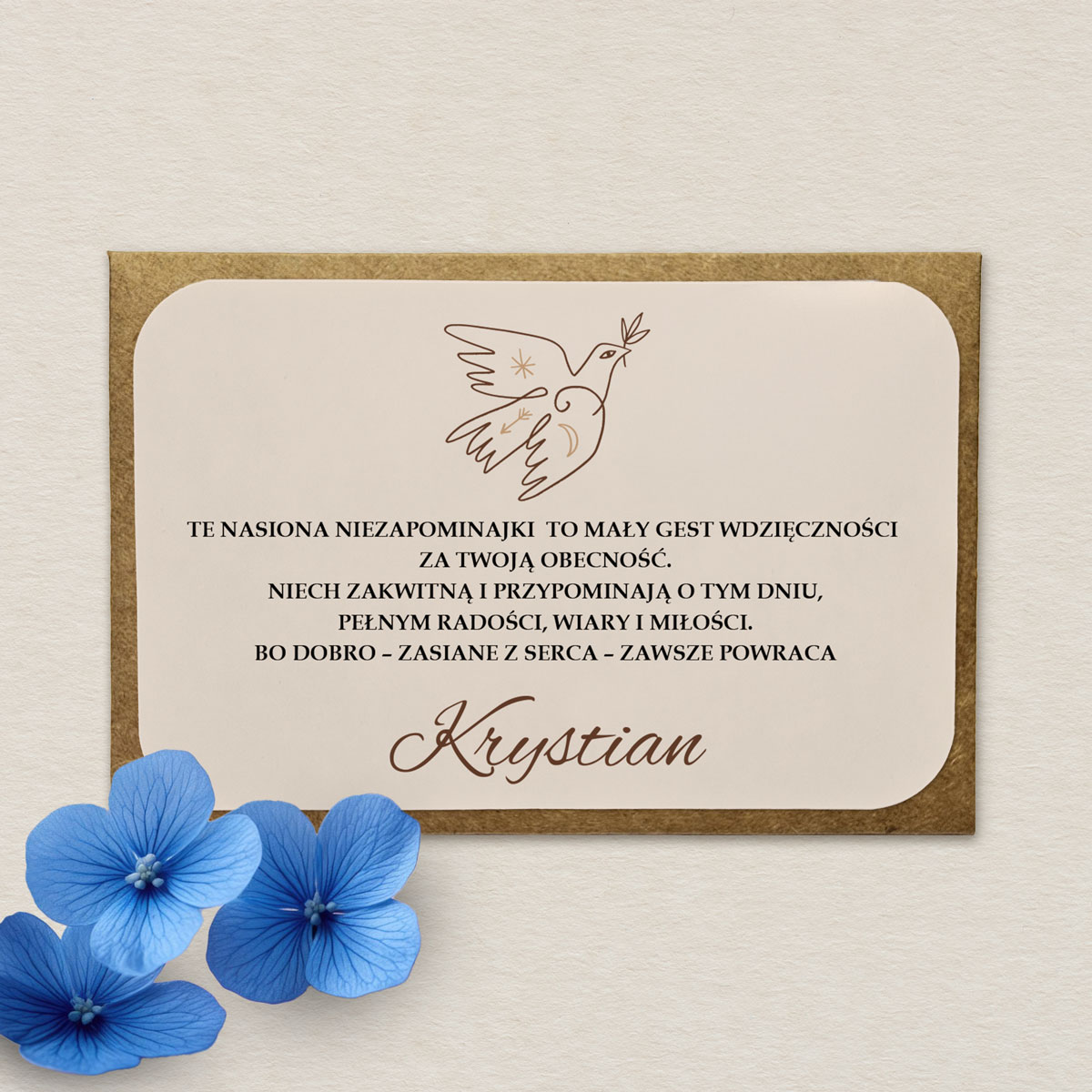 Koperta EKO z nasionami niezapominajki to wyjątkowe i symboliczne podziękowanie dla gości z okazji Pierwszej Komunii Świętej. W środku znajdują się nasiona, które po zasianiu zakwitną pięknymi kwiatami, przypominając o tym wyjątkowym dniu. Koperta ozdobiona jest personalizowaną, delikatnie połyskującą naklejką z wybranym wzorem oraz własnym tekstem. Do wyboru niezapominajka niebieska lub różowa.