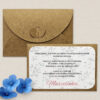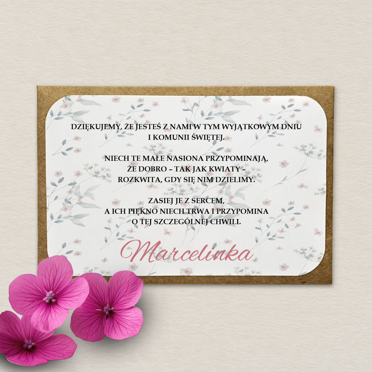 Koperta EKO z nasionami niezapominajki to wyjątkowe i symboliczne podziękowanie dla gości z okazji Pierwszej Komunii Świętej. W środku znajdują się nasiona, które po zasianiu zakwitną pięknymi kwiatami, przypominając o tym wyjątkowym dniu. Koperta ozdobiona jest personalizowaną, delikatnie połyskującą naklejką z wybranym wzorem oraz własnym tekstem. Do wyboru niezapominajka niebieska lub różowa.