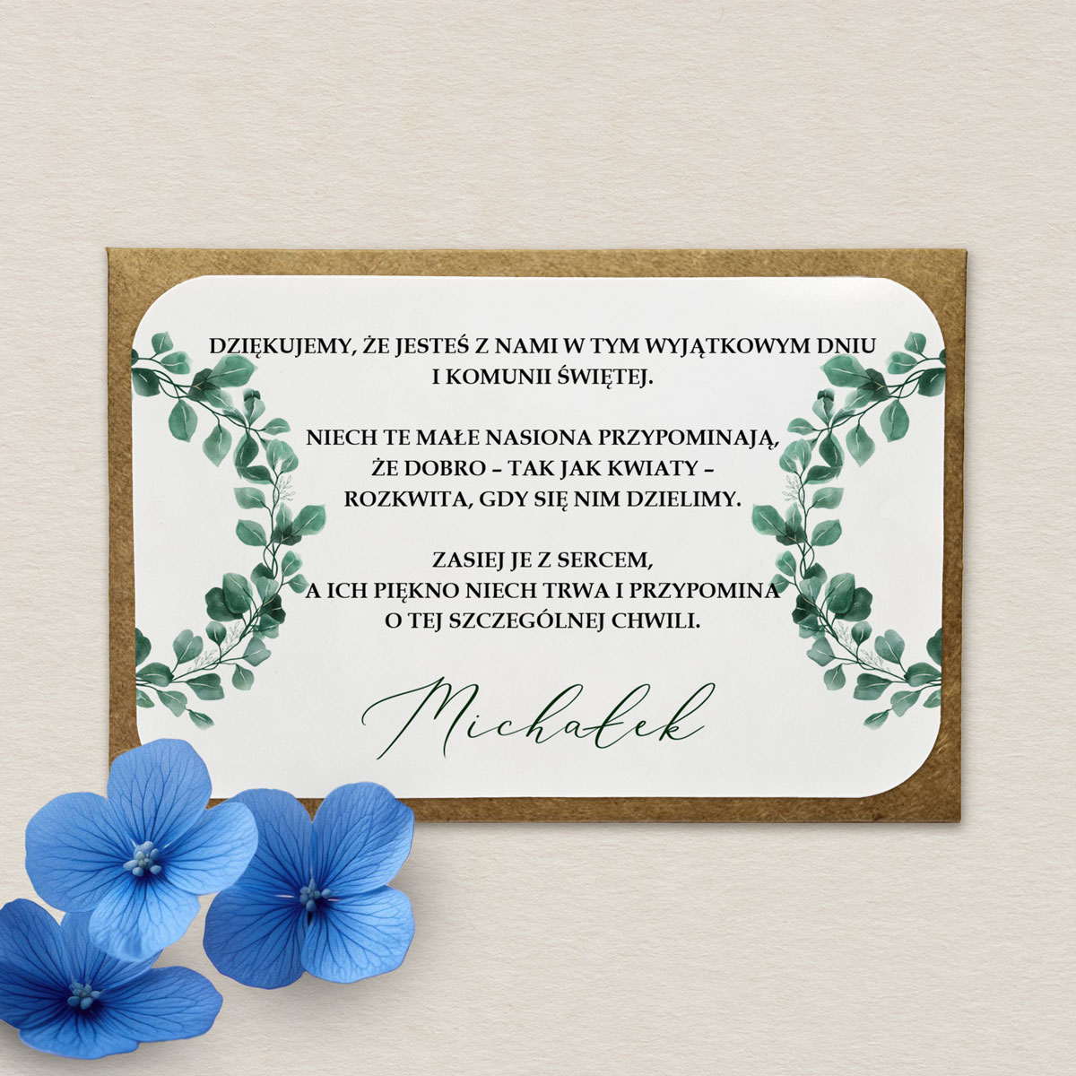 Koperta EKO z nasionami niezapominajki to wyjątkowe i symboliczne podziękowanie dla gości z okazji Pierwszej Komunii Świętej. W środku znajdują się nasiona, które po zasianiu zakwitną pięknymi kwiatami, przypominając o tym wyjątkowym dniu. Koperta ozdobiona jest personalizowaną, delikatnie połyskującą naklejką z wybranym wzorem oraz własnym tekstem. Do wyboru niezapominajka niebieska lub różowa.
