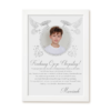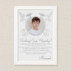 Personalizowany nadruk z imieniem i datą uroczystości, starannie dobrane grafiki oraz gotowa biała ramka tworzą wyjątkową pamiątkę na lata.