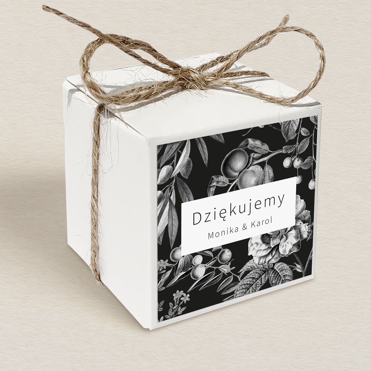 Do wyboru sznurek: jutowy, srebrny, złoty lub biała wstążka