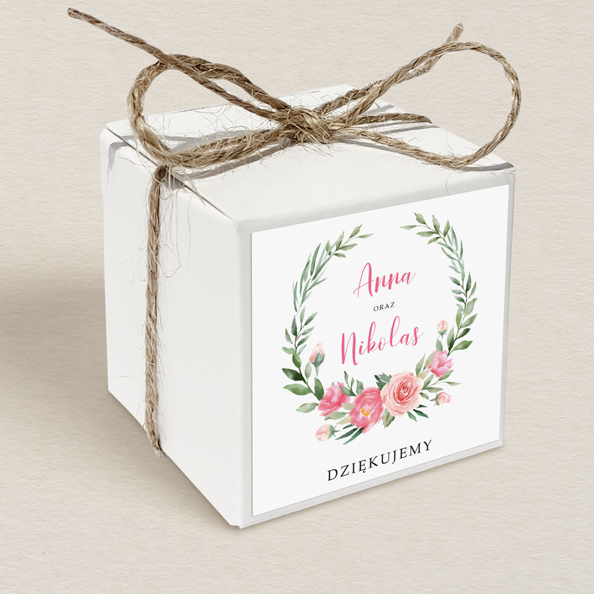 Do wyboru sznurek: jutowy, srebrny, złoty lub biała wstążka