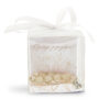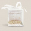 Delikatne koraliki, ozdobna biała wstążka, personalizacja sprawiają, że upominek jest piękną i symboliczną pamiątką tego ważnego dnia. Pudełeczko  prezentuje się elegancko i jest gotowe do wręczenia gościom.