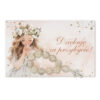 Różaniec wykonany jest ze szklanych koralików z ozdobnym srebrnym krzyżykiem, a całość dopełnia piękna karteczka komunijna z możliwością wyboru wzoru dla dziewczynki lub chłopca oraz personalizacji imienia i daty uroczystości.