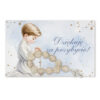 Różaniec wykonany jest ze szklanych koralików z ozdobnym srebrnym krzyżykiem, a całość dopełnia piękna karteczka komunijna z możliwością wyboru wzoru dla dziewczynki lub chłopca oraz personalizacji imienia i daty uroczystości.