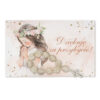 Różaniec wykonany jest ze szklanych koralików z ozdobnym srebrnym krzyżykiem, a całość dopełnia piękna karteczka komunijna z możliwością wyboru wzoru dla dziewczynki lub chłopca oraz personalizacji imienia i daty uroczystości.