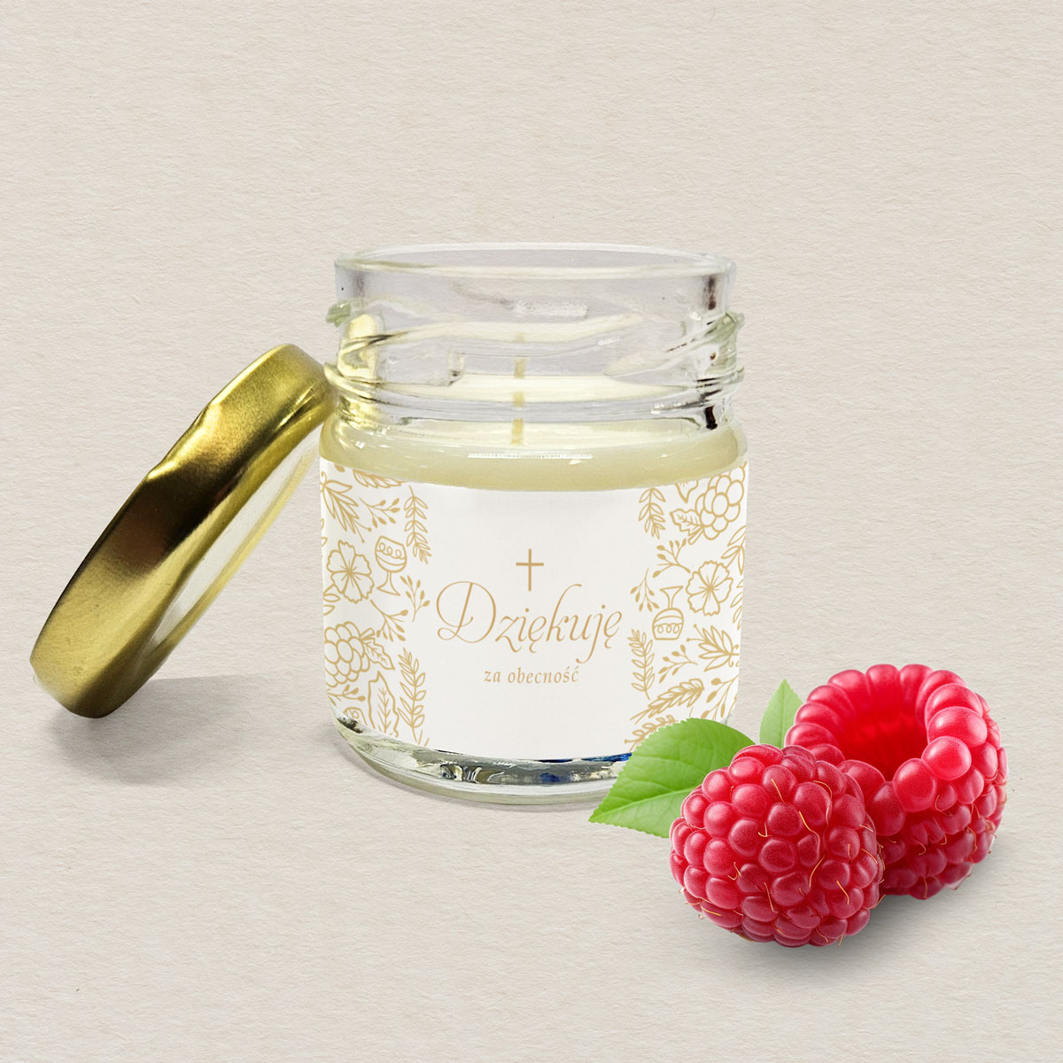 Elegancka świeczka zapachowa w szklanym słoiczku z personalizowaną naklejką to wyjątkowe podziękowanie dla gości na Pierwszą Komunię Świętą. Zapakowana w celofanowy woreczek z białą wstążką stanowi piękną pamiątkę tego ważnego dnia.