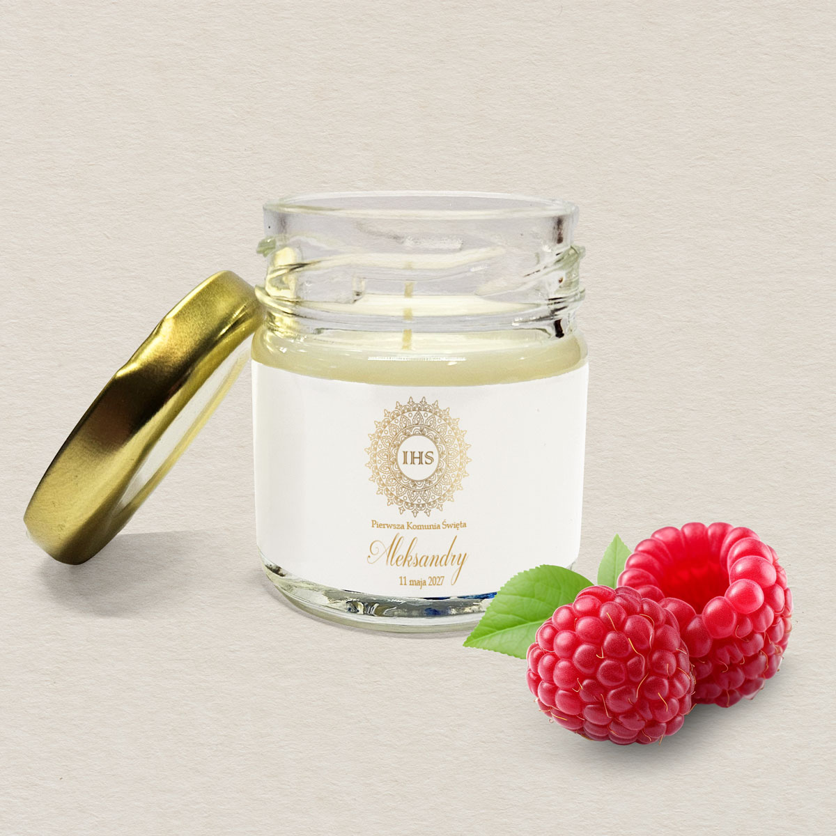 Elegancka świeczka zapachowa w szklanym słoiczku z personalizowaną naklejką to wyjątkowe podziękowanie dla gości na Pierwszą Komunię Świętą. Zapakowana w celofanowy woreczek z białą wstążką stanowi piękną pamiątkę tego ważnego dnia.