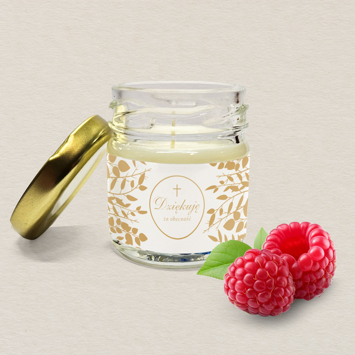 Elegancka świeczka zapachowa w szklanym słoiczku z personalizowaną naklejką to wyjątkowe podziękowanie dla gości na Pierwszą Komunię Świętą. Zapakowana w celofanowy woreczek z białą wstążką stanowi piękną pamiątkę tego ważnego dnia.