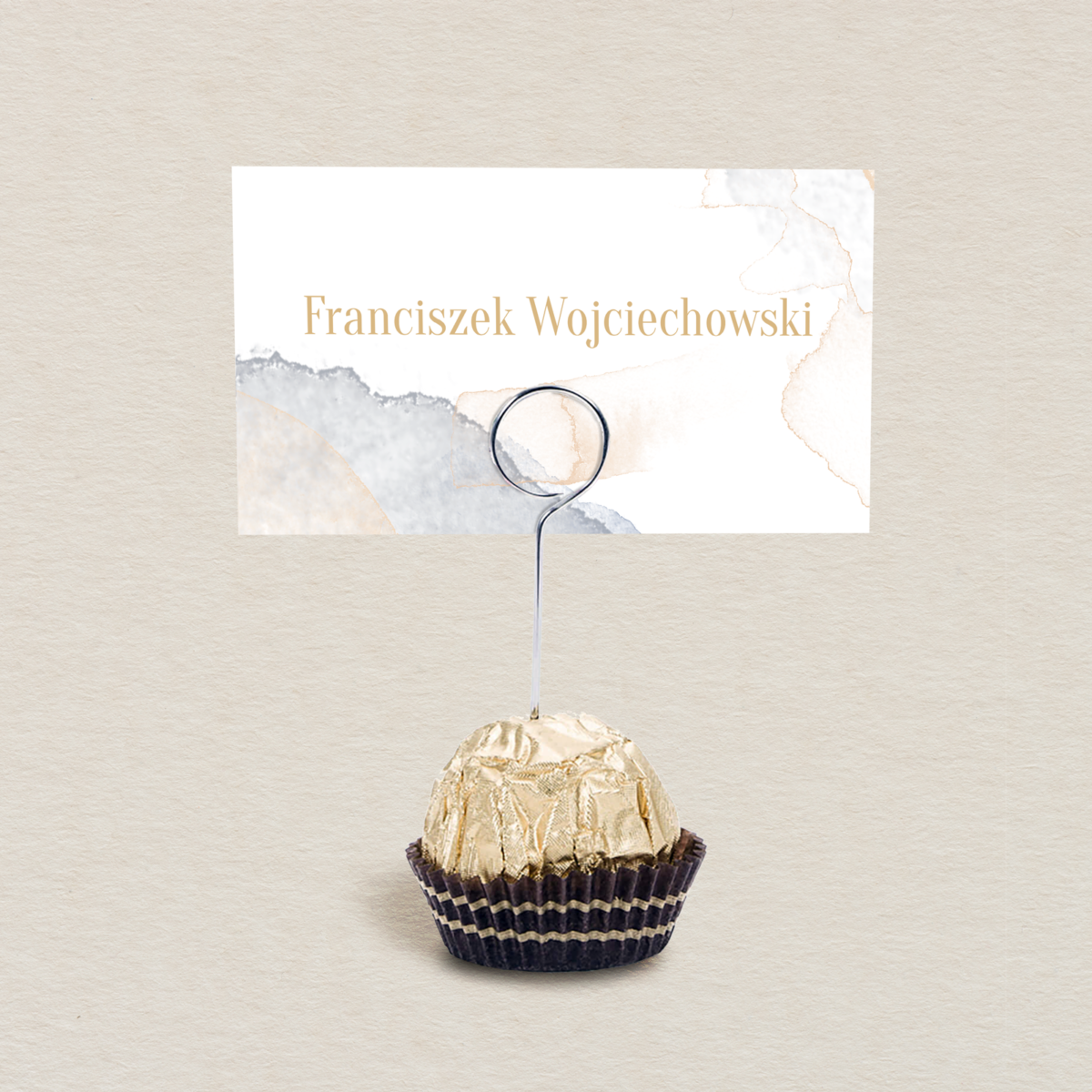Lubisz proste i intrygujące połączenia, które naturalnie i z fantazją poruszają wrażliwe struny w sercach ludzi? Chcesz zaskakiwać, a pomysłowość i praktyczne rozwiązania to Twoje ukryte talenty? Pomyśl o takim spersonalizowaniu winietek ślubnych, aby z jednej strony pełniły one funkcję strażnika porządku, który przypilnuje przypisanego miejsca, a z drugiej przekazały Twoim gościom wdzięczność i radość, którą czujesz dzięki ich obecności. Podaruj im słodki prezent na stojaku z czekoladką Ferrero rocher, która swoim kremowym, orzechowo-czekoladowym smakiem z chrupiącym dodatkiem orzechów laskowych skradnie ich uwagę i rozpieści podniebienia. Pamiętaj, że na odwrocie personalizowanej karteczki możesz napisać uroczą wiadomość, która będzie inna dla każdej zaproszonej osoby.