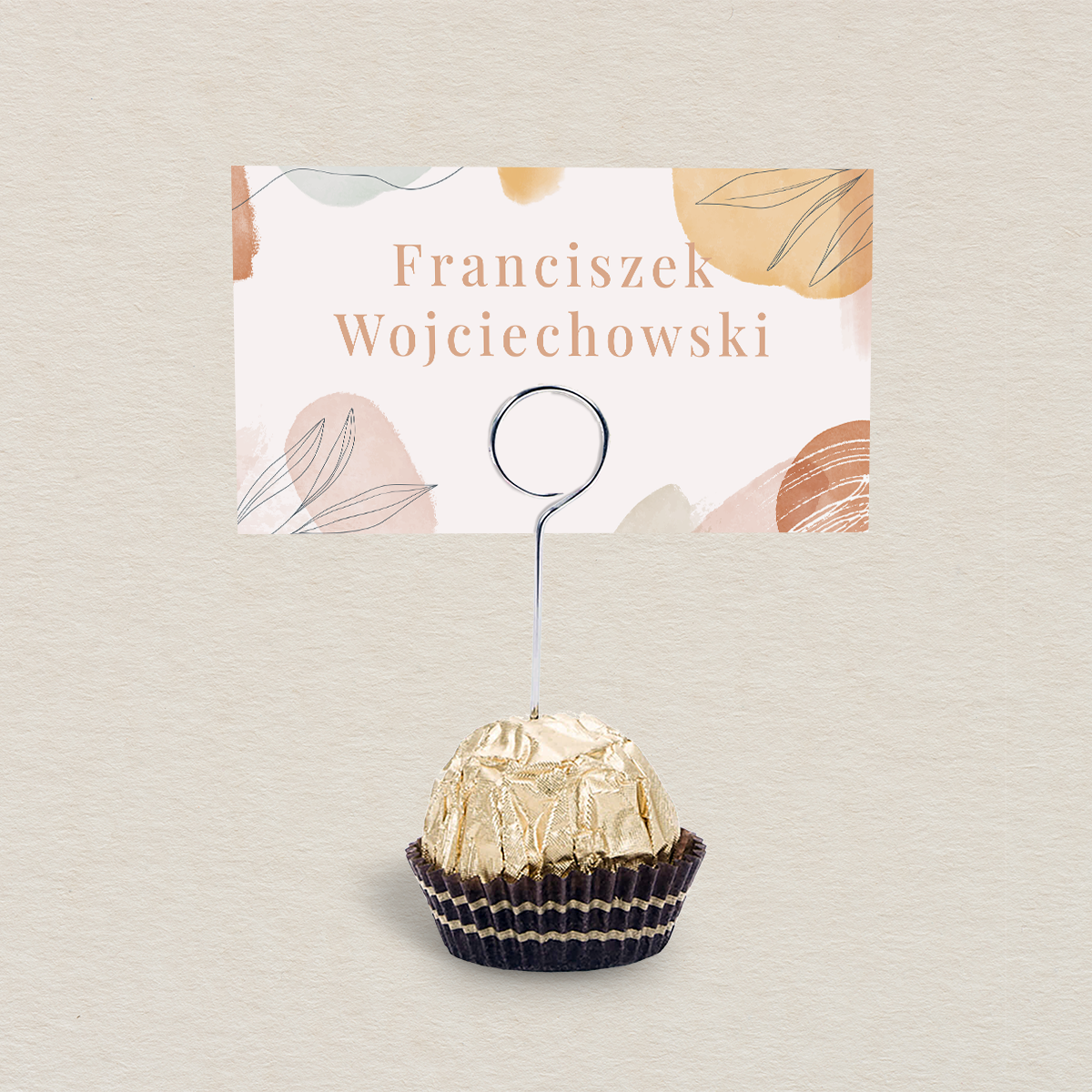 Lubisz proste i intrygujące połączenia, które naturalnie i z fantazją poruszają wrażliwe struny w sercach ludzi? Chcesz zaskakiwać, a pomysłowość i praktyczne rozwiązania to Twoje ukryte talenty? Pomyśl o takim spersonalizowaniu winietek ślubnych, aby z jednej strony pełniły one funkcję strażnika porządku, który przypilnuje przypisanego miejsca, a z drugiej przekazały Twoim gościom wdzięczność i radość, którą czujesz dzięki ich obecności. Podaruj im słodki prezent na stojaku z czekoladką Ferrero rocher, która swoim kremowym, orzechowo-czekoladowym smakiem z chrupiącym dodatkiem orzechów laskowych skradnie ich uwagę i rozpieści podniebienia. Pamiętaj, że na odwrocie personalizowanej karteczki możesz napisać uroczą wiadomość, która będzie inna dla każdej zaproszonej osoby.