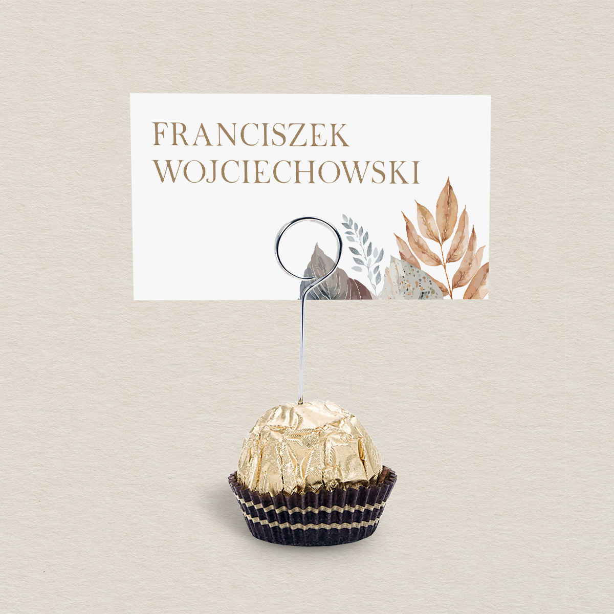 Lubisz proste i intrygujące połączenia, które naturalnie i z fantazją poruszają wrażliwe struny w sercach ludzi? Chcesz zaskakiwać, a pomysłowość i praktyczne rozwiązania to Twoje ukryte talenty? Pomyśl o takim spersonalizowaniu winietek weselnych, aby z jednej strony pełniły one funkcję strażnika porządku, który przypilnuje przypisanego miejsca, a z drugiej przekazały Twoim gościom wdzięczność i radość, którą czujesz dzięki ich obecności. Podaruj im słodki prezent na stojaku z czekoladką Ferrero rocher, która swoim kremowym, orzechowo-czekoladowym smakiem z chrupiącym dodatkiem orzechów laskowych skradnie ich uwagę i rozpieści podniebienia. Pamiętaj, że na odwrocie personalizowanej karteczki możesz napisać uroczą wiadomość, która będzie inna dla każdej zaproszonej osoby.