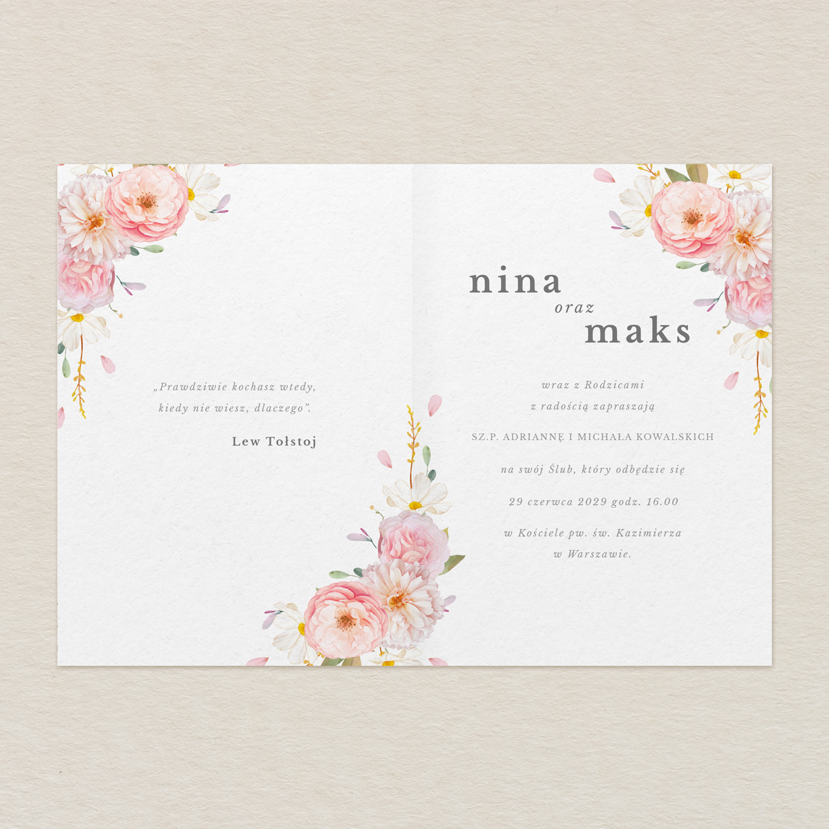 odzwierciedli łączące Was uczucia i pokrewieństwo dusz? Pragniecie zaakcentować wolność, zatopić się w marzeniach i rozkoszować się pięknem otaczającego Was świata natury? Cenicie tradycję, elegancję i wyczucie smaku, a także dystans i beztroski luz? A może w wyjątkowym dniu planujecie po prostu odpłynąć daleko od zgiełku głośnego miasta i otoczyć się smakiem miłości, zapachem polnych kwiatów i widokiem błękitnego nieba? Urzekające delikatnością i bogactwem kolorów zaproszenia ślubne z bukietem roślin to propozycja, której szukacie. Delektujcie się chwilą i spotkaniem z najbliższymi i z pomocą tej niezwykłej papeterii, zaproście ich do wspólnego przeżywania wspaniałej ceremonii.