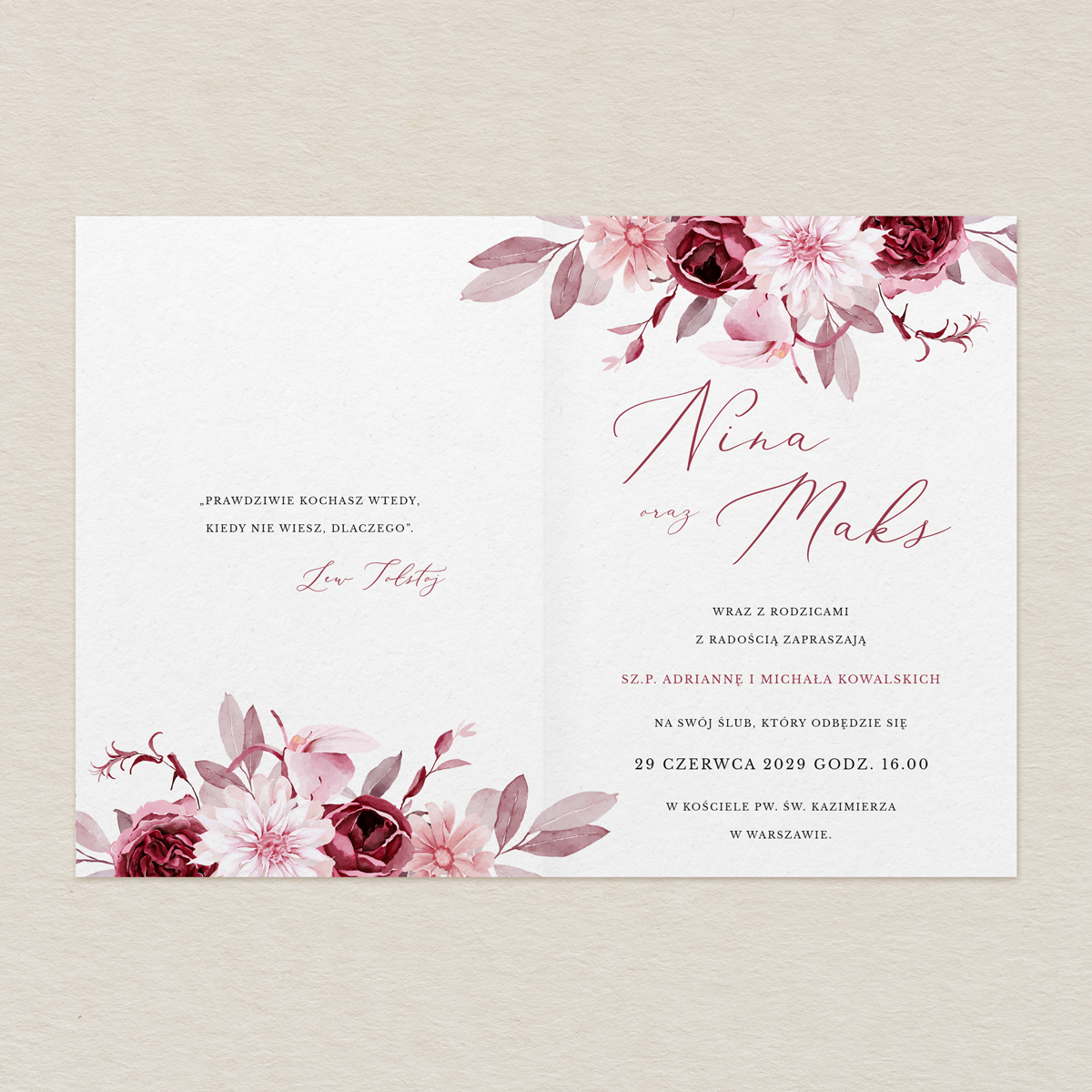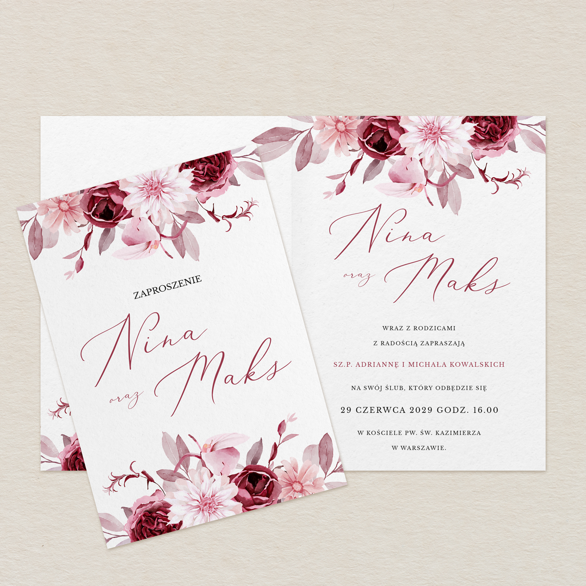 Wzór bogaty w finezję, z idealnie odwzorowanym realizmem polnych kwiatów i wyszukaną swobodą powstał z myślą o parach, które ślubną podróż planują rozpocząć bez wyczerpującego biegu w nieznane. Intrygujący projekt zaproszeń, w którym harmonia i równowaga łączą się z intensywną paletą kolorów, by w kulminacyjnym punkcie kompozycji zaakcentować tradycyjny powrót na łono natury. Ozdobna czcionka w kolorze miłości i spersonalizowany tekst z pewnością dodadzą kreacji niezwykłego charakteru i wartości. Oddajcie się bez reszty sielskiemu klimatowi beztroski i połączcie niezwykłym węzłem uczuć wszystkie plany, marzenia i emocje. Zaproście gości na uroczystość w Waszym własnym, autorskim stylu i stwórzcie atmosferę, w której sami czujecie się najlepiej.