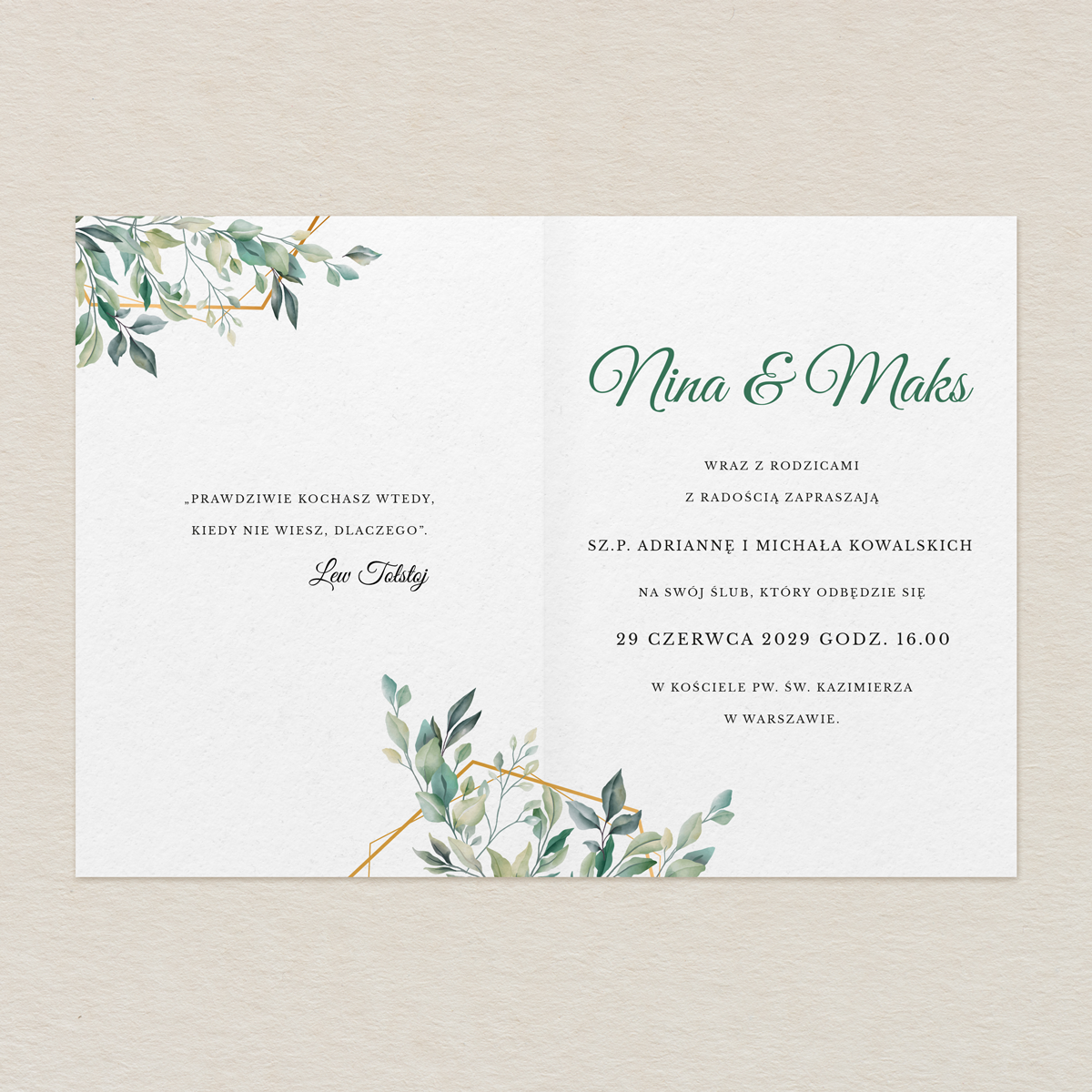 Nieprzemijająca elegancja zaklęta w zaproszeniach ślubnych z motywem  lśniącego złota i naturalnych liści symbolizujących nadzieję, harmonię i życie.