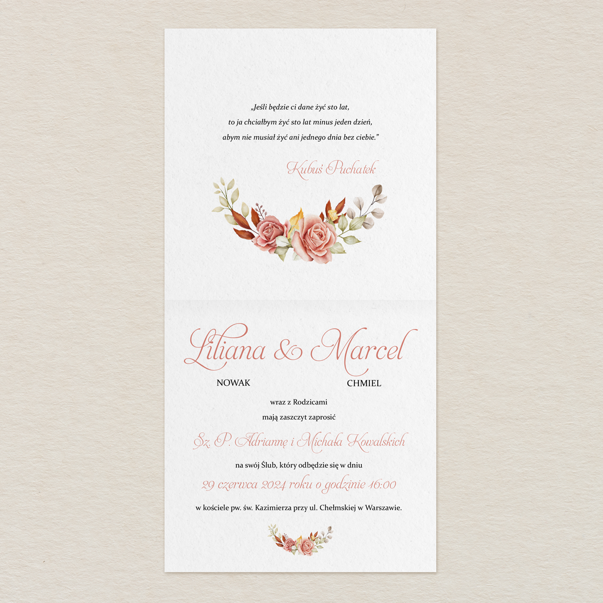Wiesz, że w słynącym z wyrafinowanej elegancji i bogactwa oryginalnych i kosztownych zdobień stylu glamour wspaniale odnajdują się naturalne elementy w postaci kompozycji z kwiatów róż, czy delikatnych liści? Jeśli połączymy tak niezwykłą kompozycję z idealnie dobraną, wyrazistą i czytelną czcionką, a także z pięknym zdjęciem narzeczonych powstaną zaproszenia godne szczerych zachwytów. Stwórzcie niezapomniany klimat uroczystości z kwiatową kompozycją, która wyeksponuje to, co najpiękniejsze, czyli Waszą miłość uchwyconą na fotografii. Sprawcie, aby chwila spotkania z najbliższymi pełna była wzruszeń, emocji i przejmujących powrotów do wspomnień. Podarujcie swoich gościom cząstkę siebie i pozwólcie im poczuć moc, energię i znaczenie okazji.