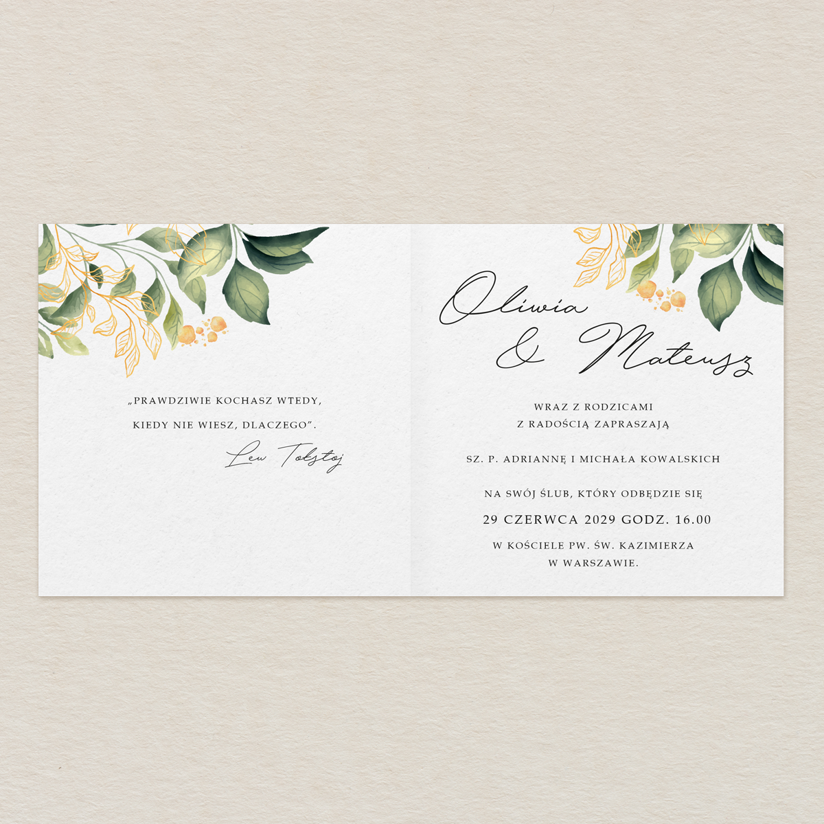 Ślub to piękna okazja, by powiedzieć: kocham, będę przy Tobie, chcę spędzić z Tobą życie i jesteś moim spełnionym marzeniem mocno, wymownie i w niesamowitej atmosferze, w otoczeniu bliskich ludzi, którzy trzymają za nas kciuki i mocno kibicują miłości. To naturalne, że chcemy celebrować ją w nieskończoność, z wielką troską i dbałością o detale oraz dobrać taki motyw zaproszenia, które idealnie wpasuje się w klimat uroczystości oraz przekaże gościom okruch uczucia i osobowości, jaką udało Wam się stworzyć w związku. Jeśli kochacie słońce, podziwiacie naturalne piękno i majestat otaczającego Was świata, a beztroska, nadzieja, optymizm i romantyczne dusze marzycieli to Wasze drugie imię, to koniecznie wybierzcie zaproszenia ślubne z bukietem delikatnych i subtelnych kwiatów, które w czarujący sposób przekażą delikatność, harmonię, fantazję i obietnicę, opisując łączącą Was więź oryginalnie i z wyczuciem smaku.
