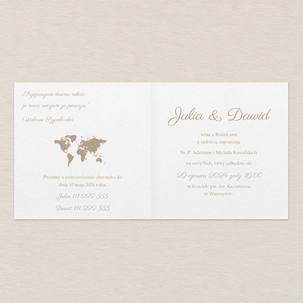 Poznaliście się w nieoczekiwanym miejscu? Wasze ścieżki splotły się przypadkiem, gdzieś na końcu świata? Może pochodzicie z różnych stron, a uczucie pokonało dzielącą Was odległość, różnice kulturowe, a nawet barierę językową? Czy Wasza wspólna historia rozpoczęła się z dala od zgiełku świata, w ciszy i beztrosce, gdy mieliście czas i przestrzeń na odkrycie własnych potrzeb serca? Jeśli czujecie, że jesteście kompletnie różni i nadal nie możecie uwierzyć, jak wspaniale się uzupełniacie i rozumiecie, to znaczy, że światowe zaproszenia są dla Was stworzone. Świat to wielkie i piękne miejsce, ale dla Was najważniejsze znaczenie ma ten wycinek, w którym miłość i szczęście zawiązały sojusz, by stać się centrum Waszego życia. Jesteście fanami podróży i eksplorowania nowych miejsc na mapie? Udajcie się w tę piękną podróż razem i podarujcie swoim gościom cząstkę siebie z zaproszeniami, które idealnie z Wami współbrzmią.