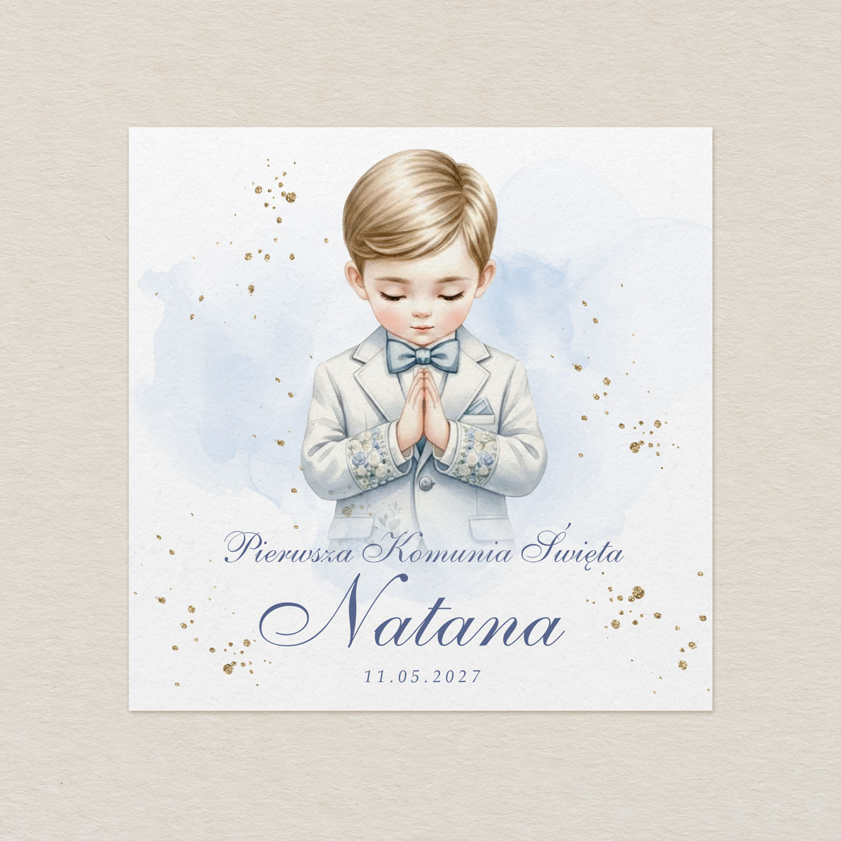 Eleganckie, personalizowane zaproszenia na Pierwszą Komunię Świętą w formacie K4 z delikatną ilustracją dziecka w stylu akwareli. Idealne dla dziewczynki lub chłopca. Każde zaproszenie wykonane jest z dbałością o detale i przygotowane indywidualnie dla Twojego dziecka.