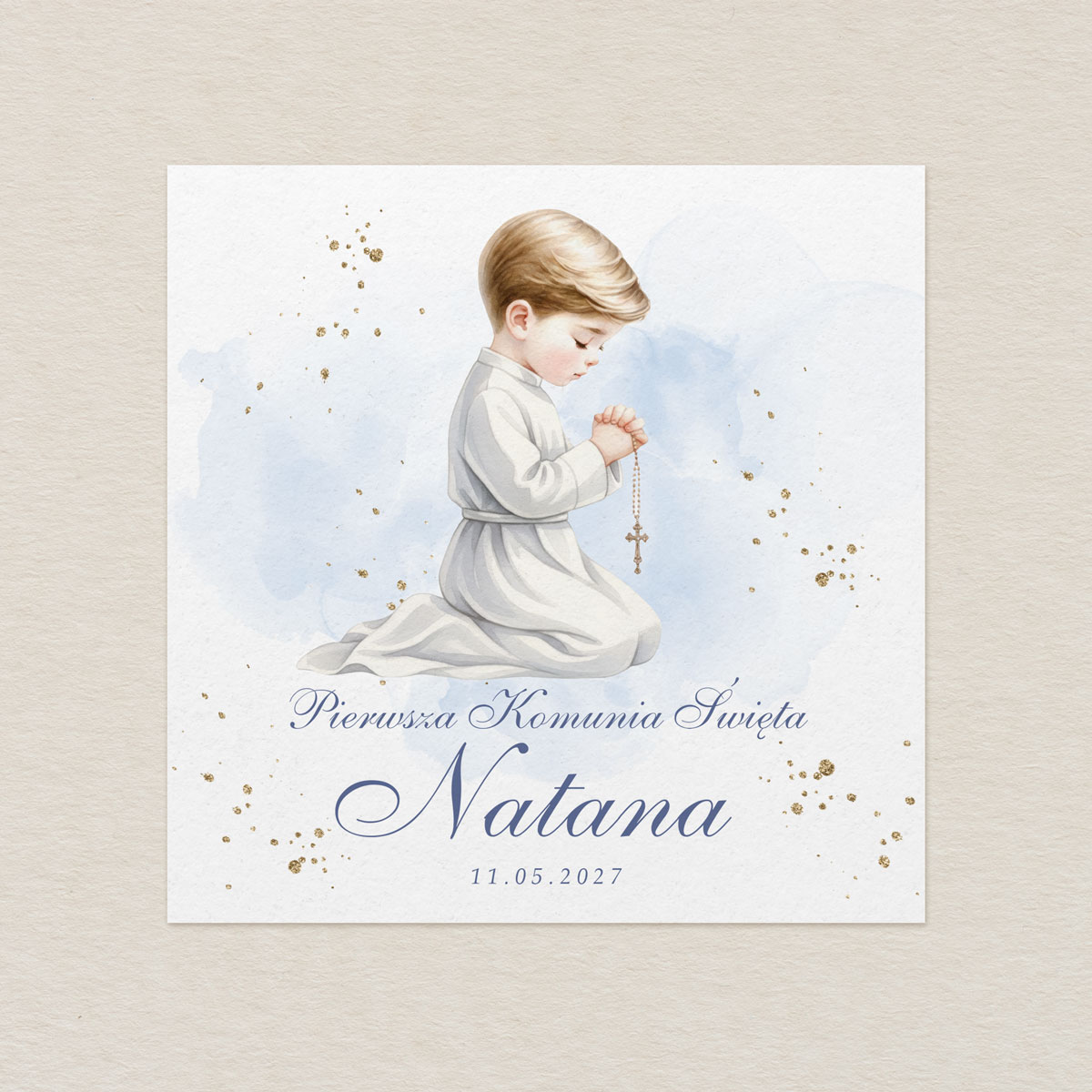 Eleganckie, personalizowane zaproszenia na Pierwszą Komunię Świętą w formacie K4 z delikatną ilustracją dziecka w stylu akwareli. Idealne dla dziewczynki lub chłopca. Każde zaproszenie wykonane jest z dbałością o detale i przygotowane indywidualnie dla Twojego dziecka.