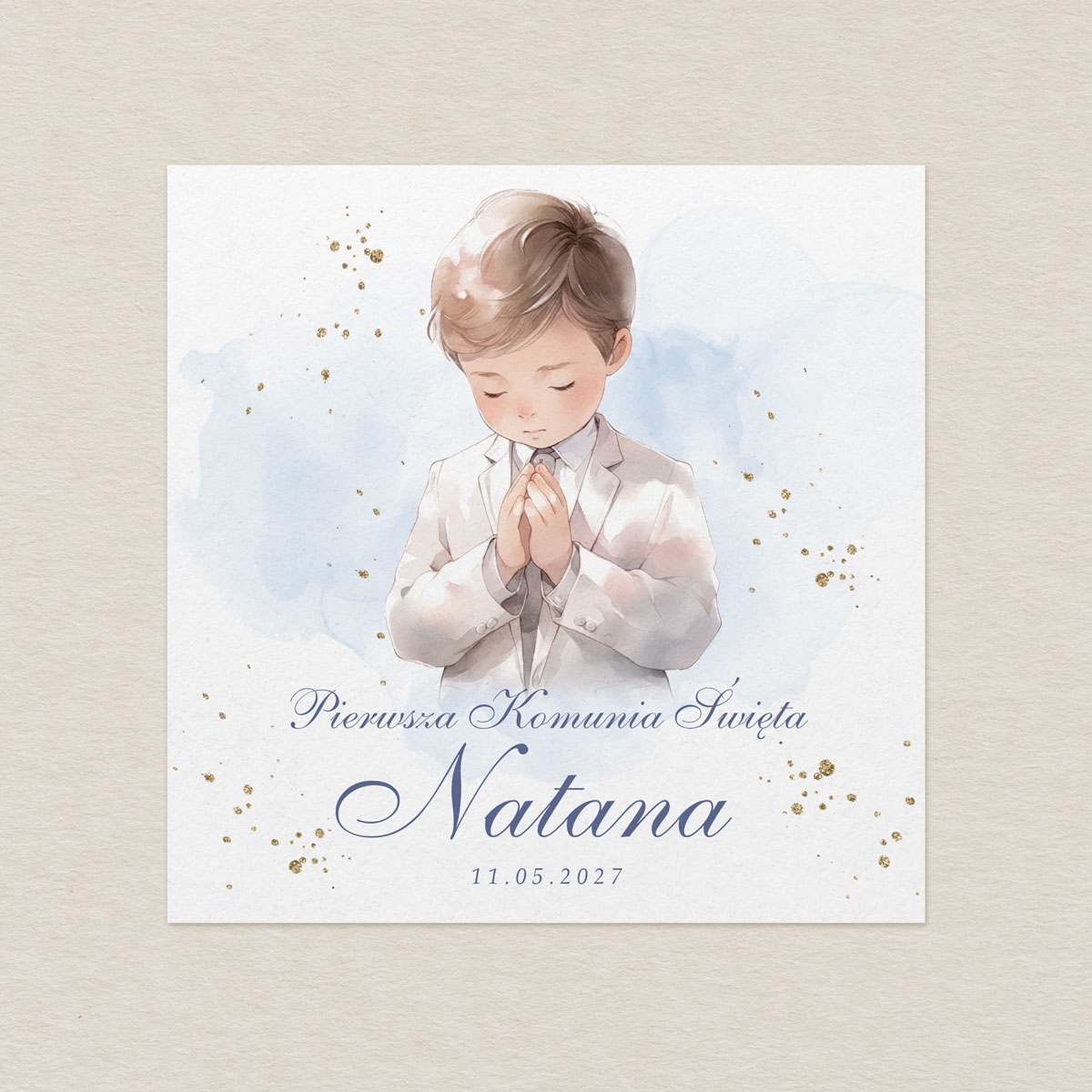 Eleganckie, personalizowane zaproszenia na Pierwszą Komunię Świętą w formacie K4 z delikatną ilustracją dziecka w stylu akwareli. Idealne dla dziewczynki lub chłopca. Każde zaproszenie wykonane jest z dbałością o detale i przygotowane indywidualnie dla Twojego dziecka.