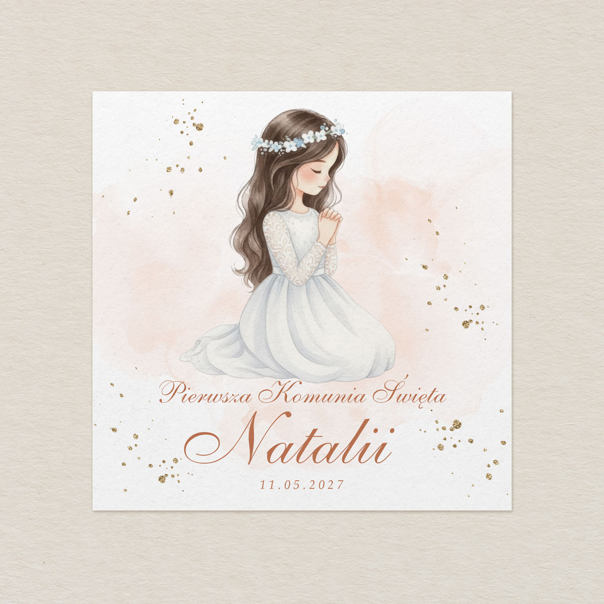 Eleganckie, personalizowane zaproszenia na Pierwszą Komunię Świętą w formacie K4 z delikatną ilustracją dziecka w stylu akwareli. Idealne dla dziewczynki lub chłopca. Każde zaproszenie wykonane jest z dbałością o detale i przygotowane indywidualnie dla Twojego dziecka.