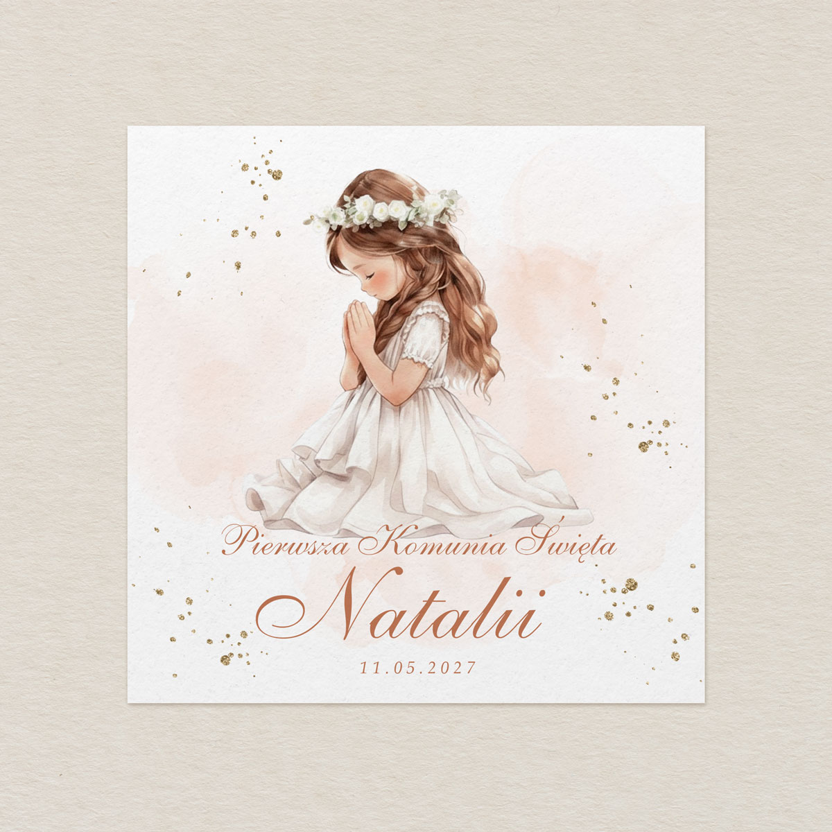 Eleganckie, personalizowane zaproszenia na Pierwszą Komunię Świętą w formacie K4 z delikatną ilustracją dziecka w stylu akwareli. Idealne dla dziewczynki lub chłopca. Każde zaproszenie wykonane jest z dbałością o detale i przygotowane indywidualnie dla Twojego dziecka.