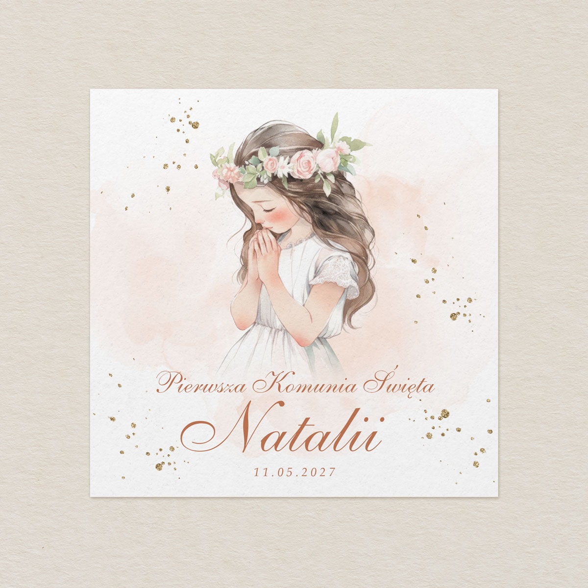 Eleganckie, personalizowane zaproszenia na Pierwszą Komunię Świętą w formacie K4 z delikatną ilustracją dziecka w stylu akwareli. Idealne dla dziewczynki lub chłopca. Każde zaproszenie wykonane jest z dbałością o detale i przygotowane indywidualnie dla Twojego dziecka.