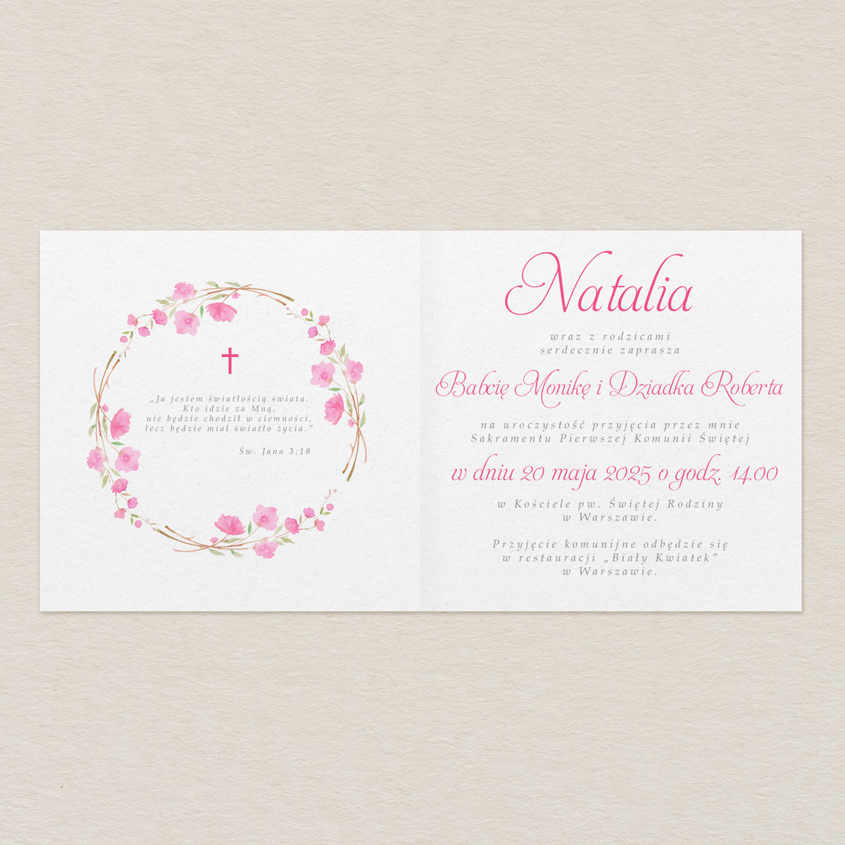 Zaproszenie na Komunię ze zdjęciem – Delikatne Różowe Kwiaty