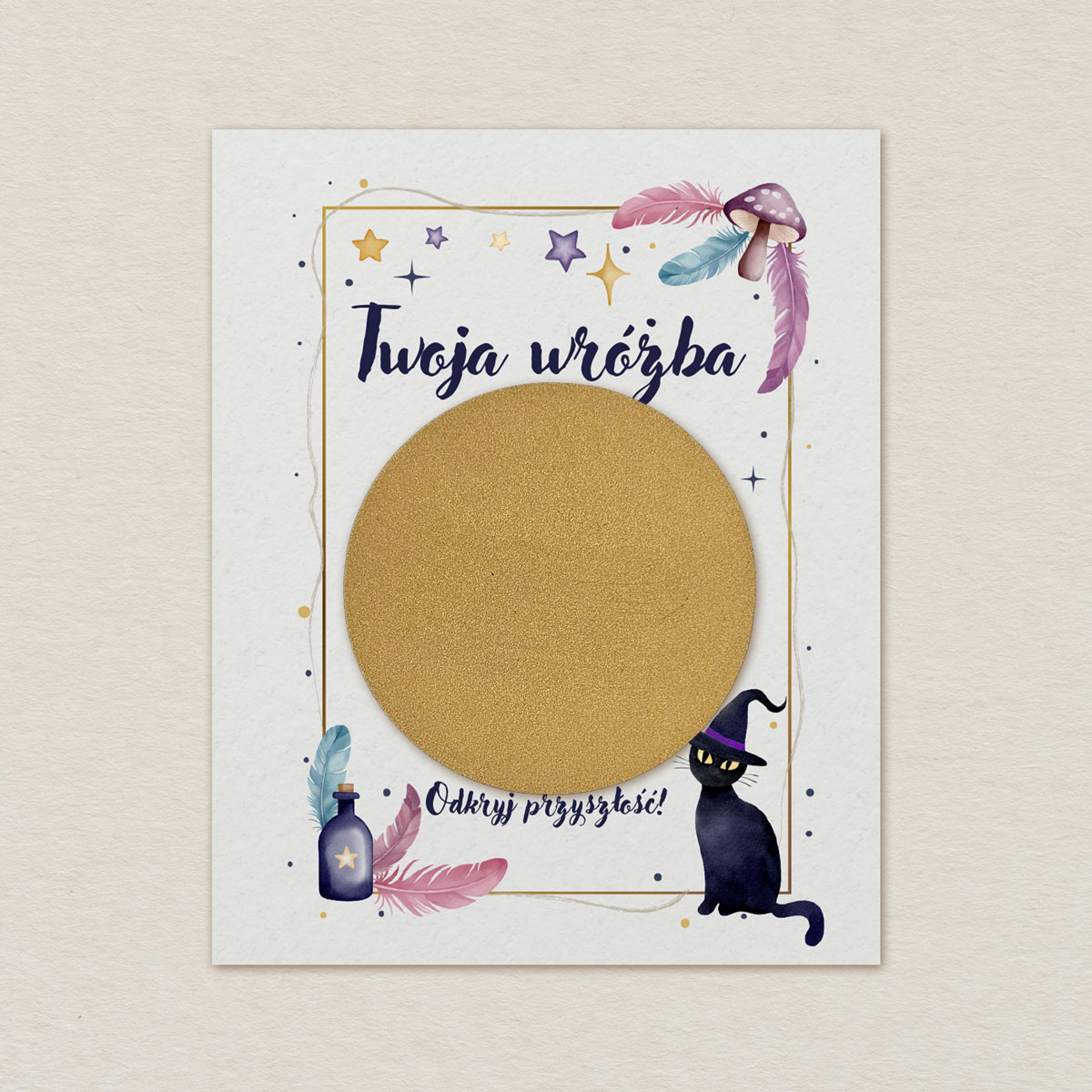 Zdrapki mają estetyczny, magiczny wzór ze złotym polem do zdrapania – gotowe do rozdania uczestnikom zabawy. To doskonały gadżet imprezowy i niezawodny sposób na rozkręcenie atmosfery podczas wróżb andrzejkowych. ✨