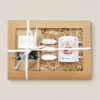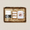 • Pudełko prezentowe z okienkiem – ekologiczne, 3-warstwowe, tekstura Fala E, gramatura 395 g/m², wypełnione dekoracyjnym siankiem.